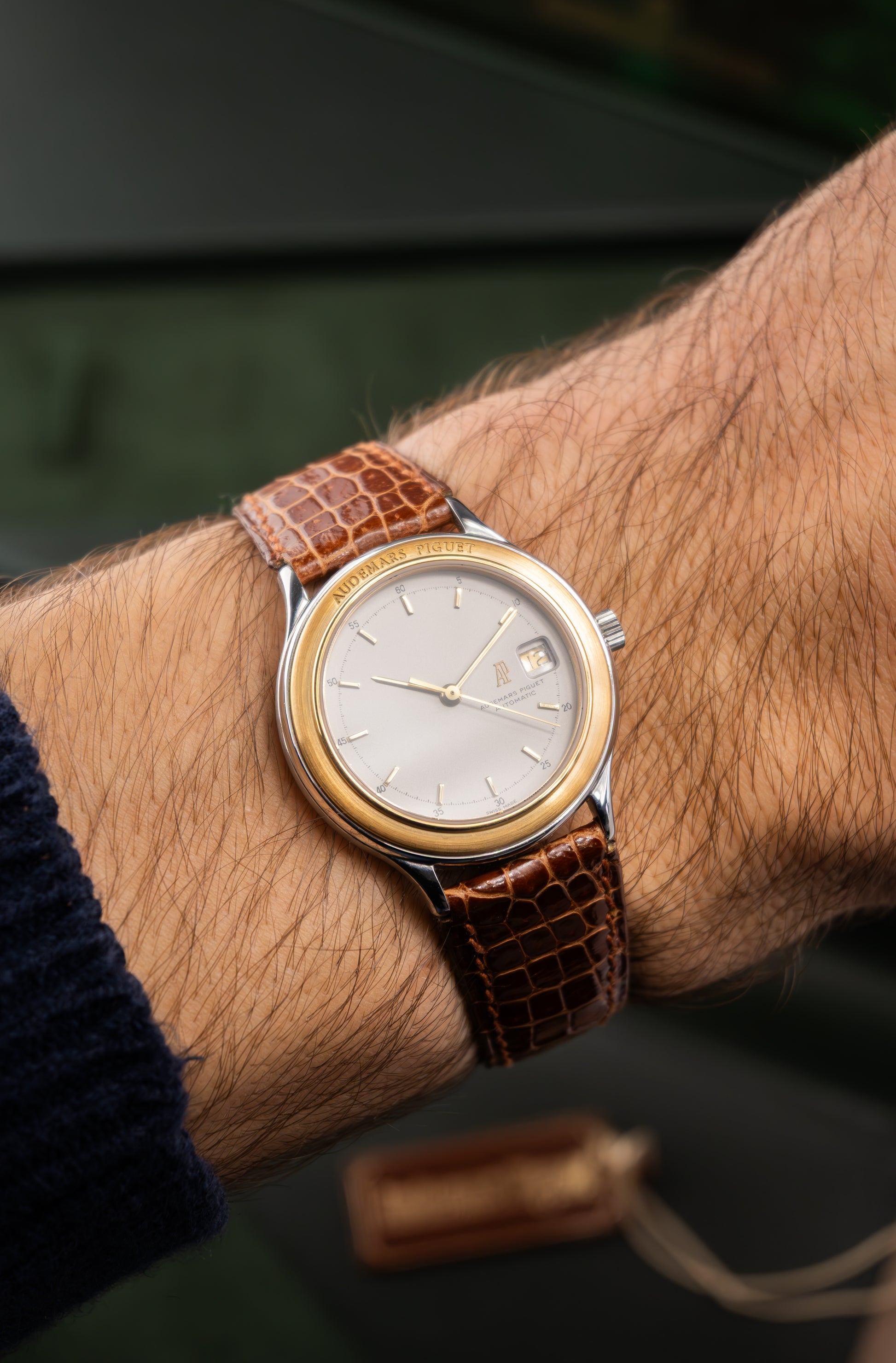 Deze AP combineert de 32 mm kast, 18k gouden bezel, AP lederen band en grijs kleurige wijzerplaat. We zien de wijzerplaat met gouden uurmarkeringen en gouden wijzers, wat het nog meer uitgesproken maakt.