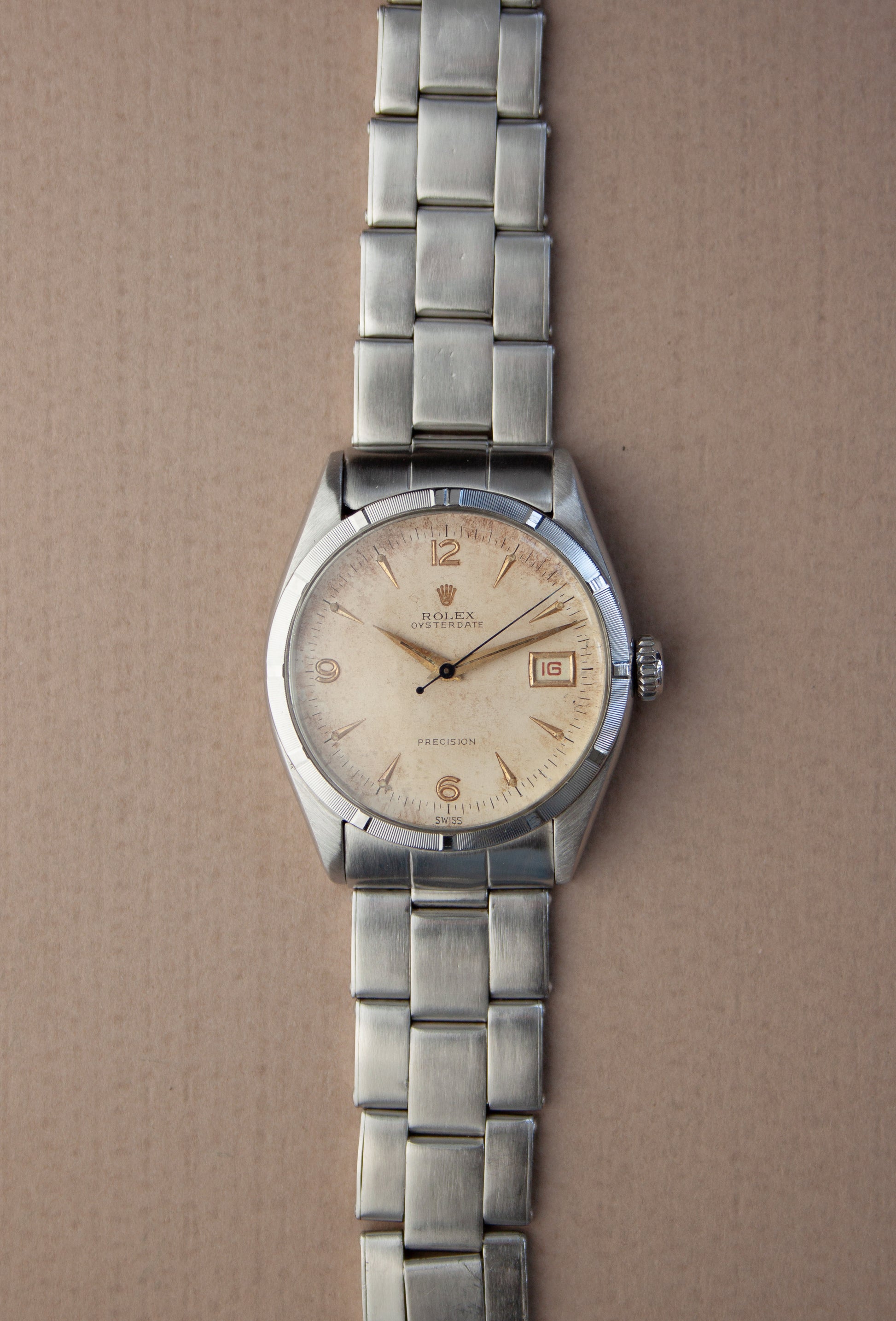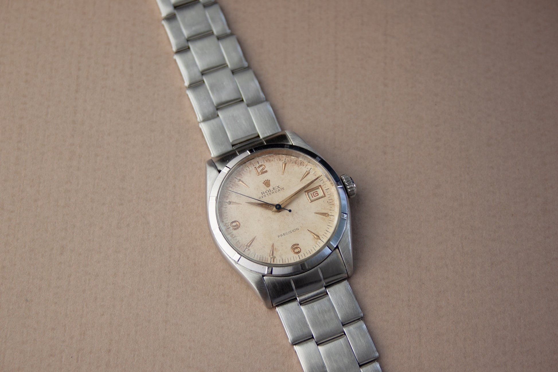 Deze ref. 6294 combineert de 34 mm stalen Oyster kast, stalen Rivet band en creme witte wijzerplaat. We zien de wijzerplaat met goudkleurige numeral en claw uurmarkeringen en goudkleurige dauphine stijl wijzers wat het nog meer uitgesproken maakt.