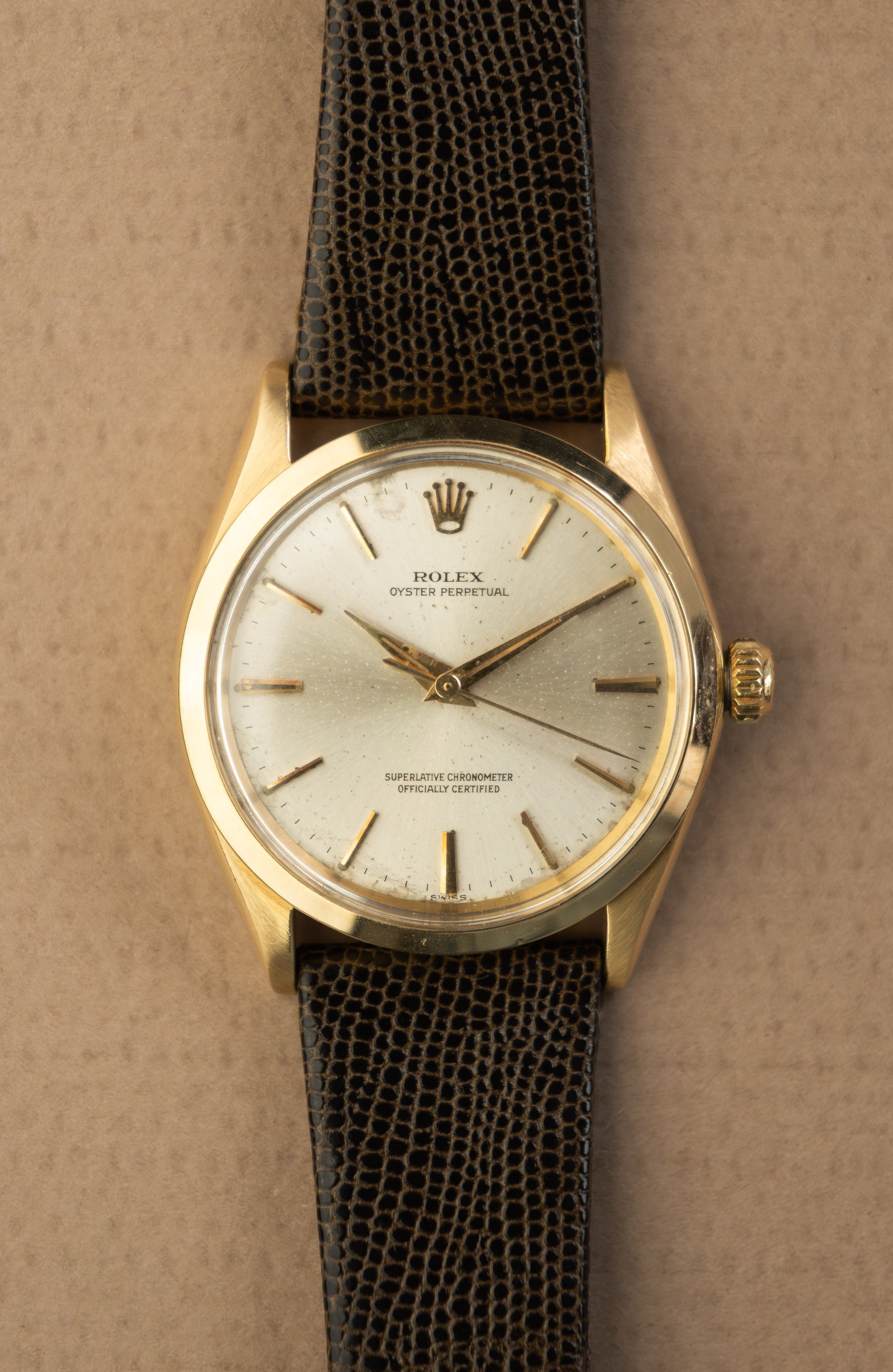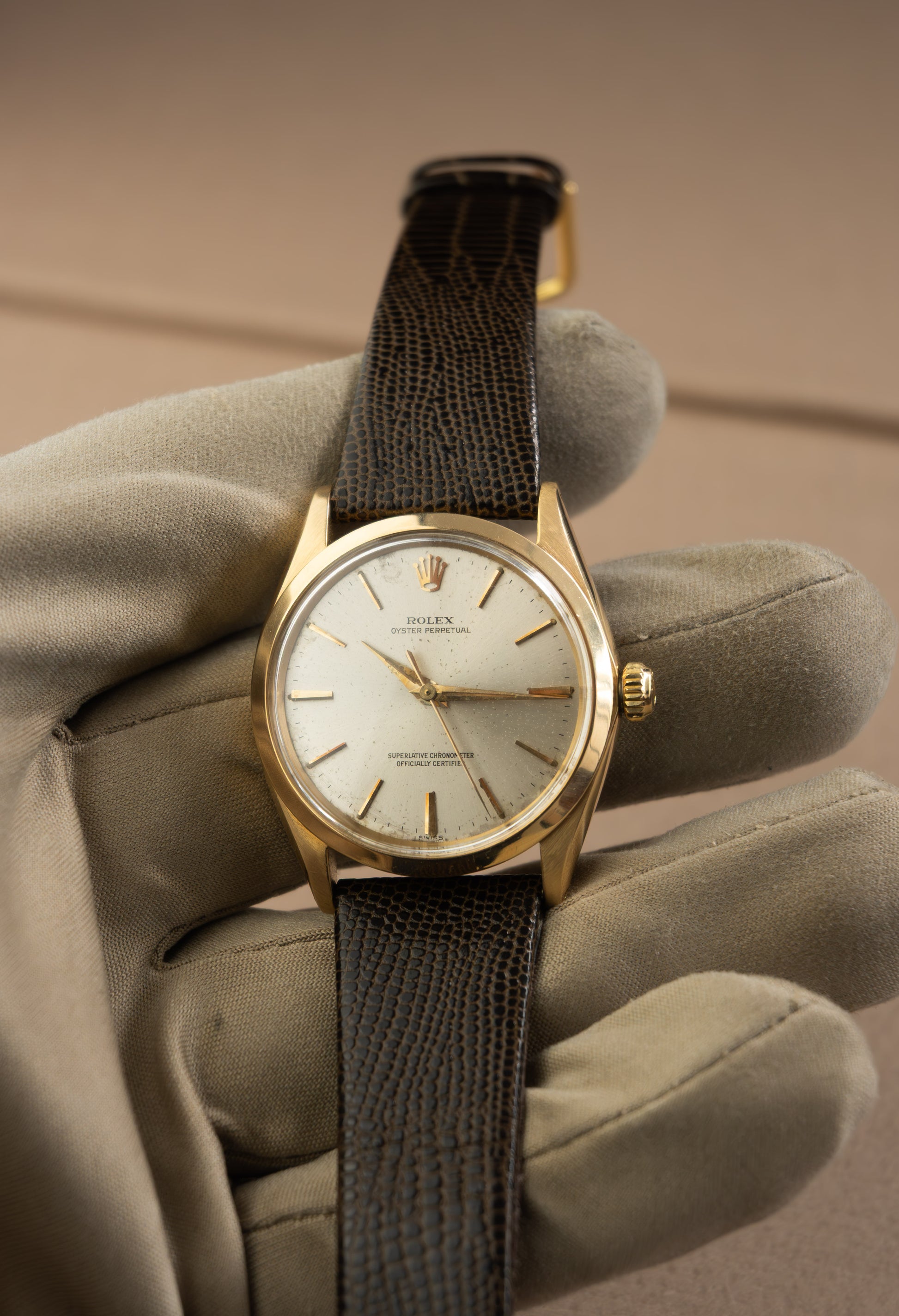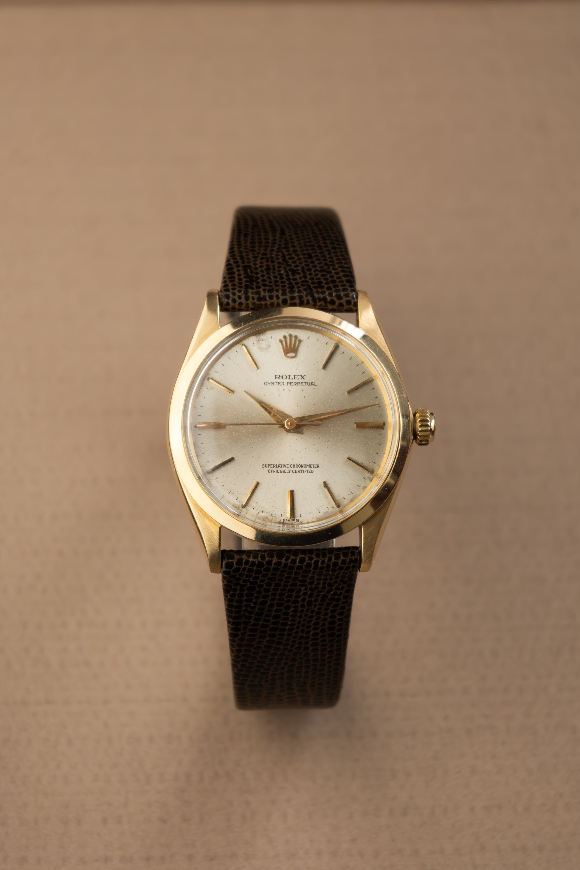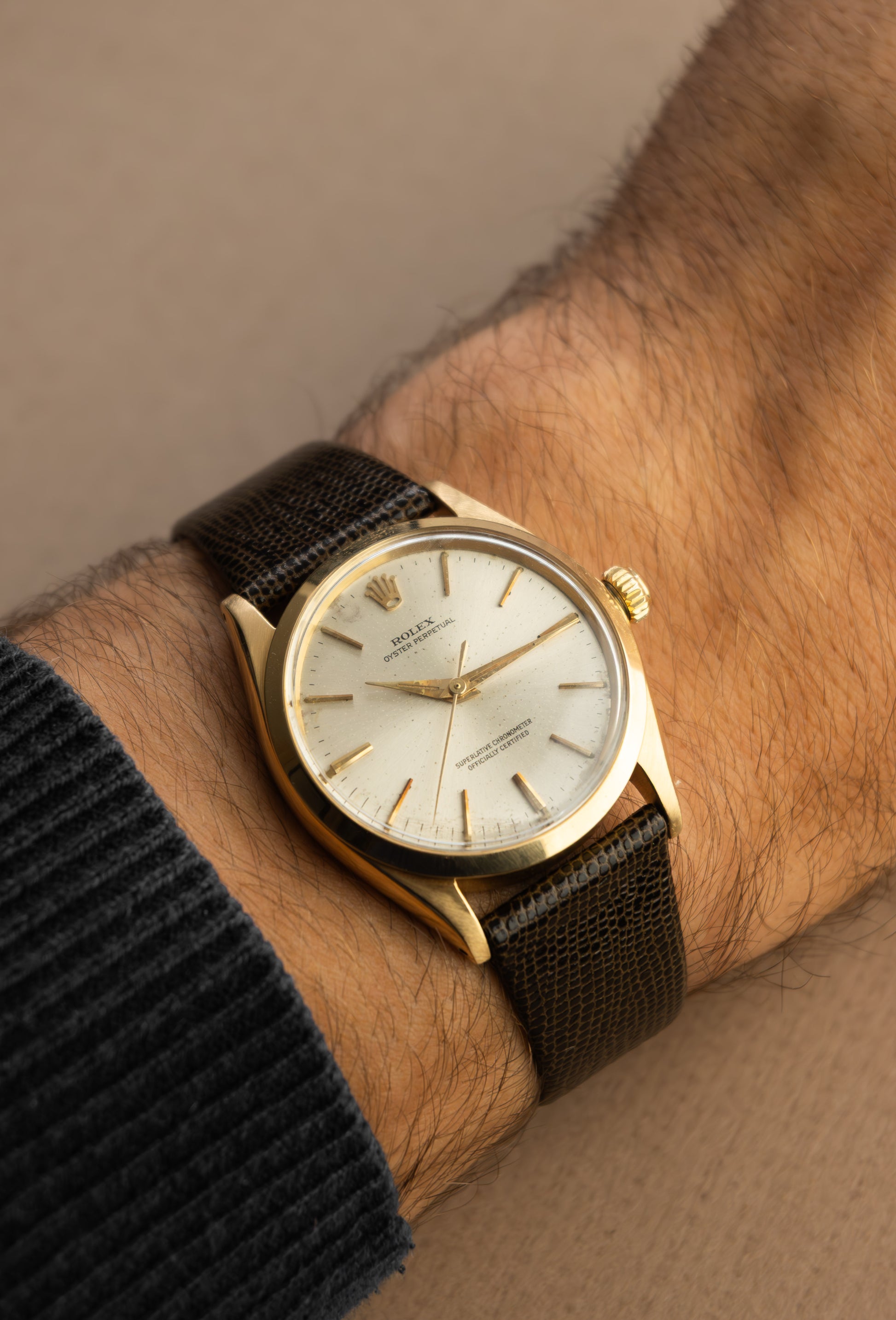 Deze ref. 1005 combineert de 34 mm 18k geel gouden Oyster kast, lederen band en zilveren wijzerplaat. We zien de wijzerplaat met gouden uurmarkeringen en goudkleurige dauphine stijl wijzers wat het nog meer uitgesproken maakt.