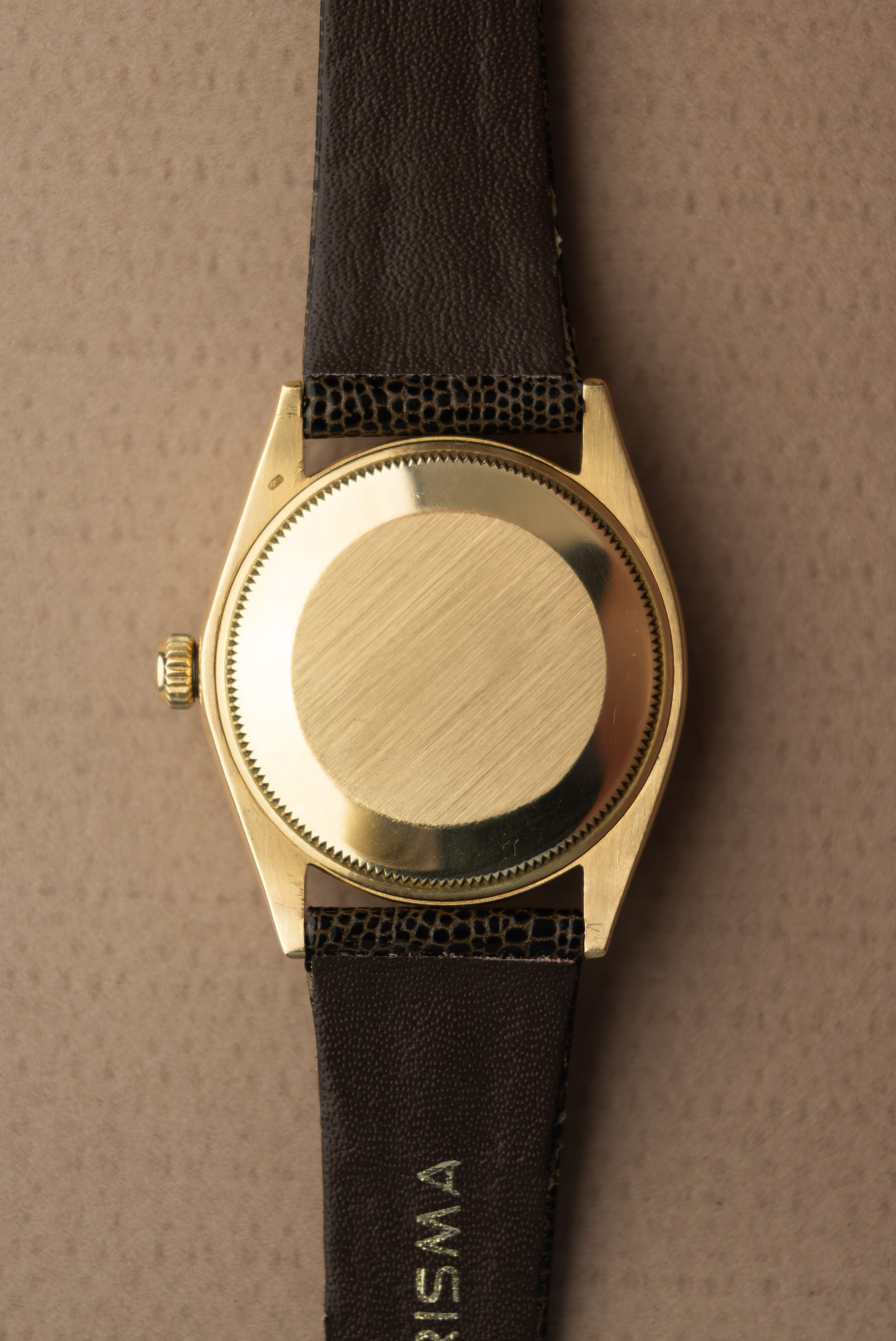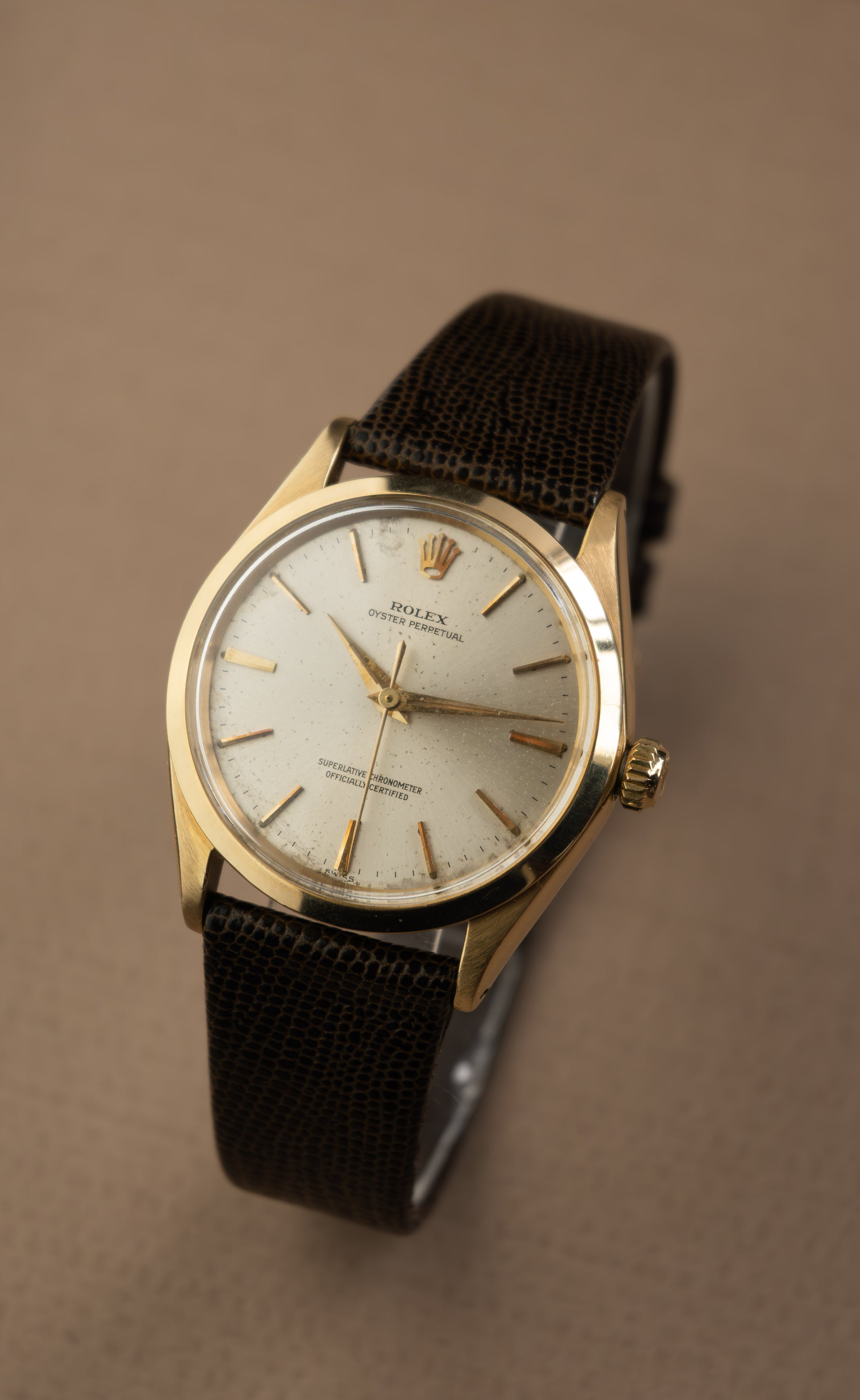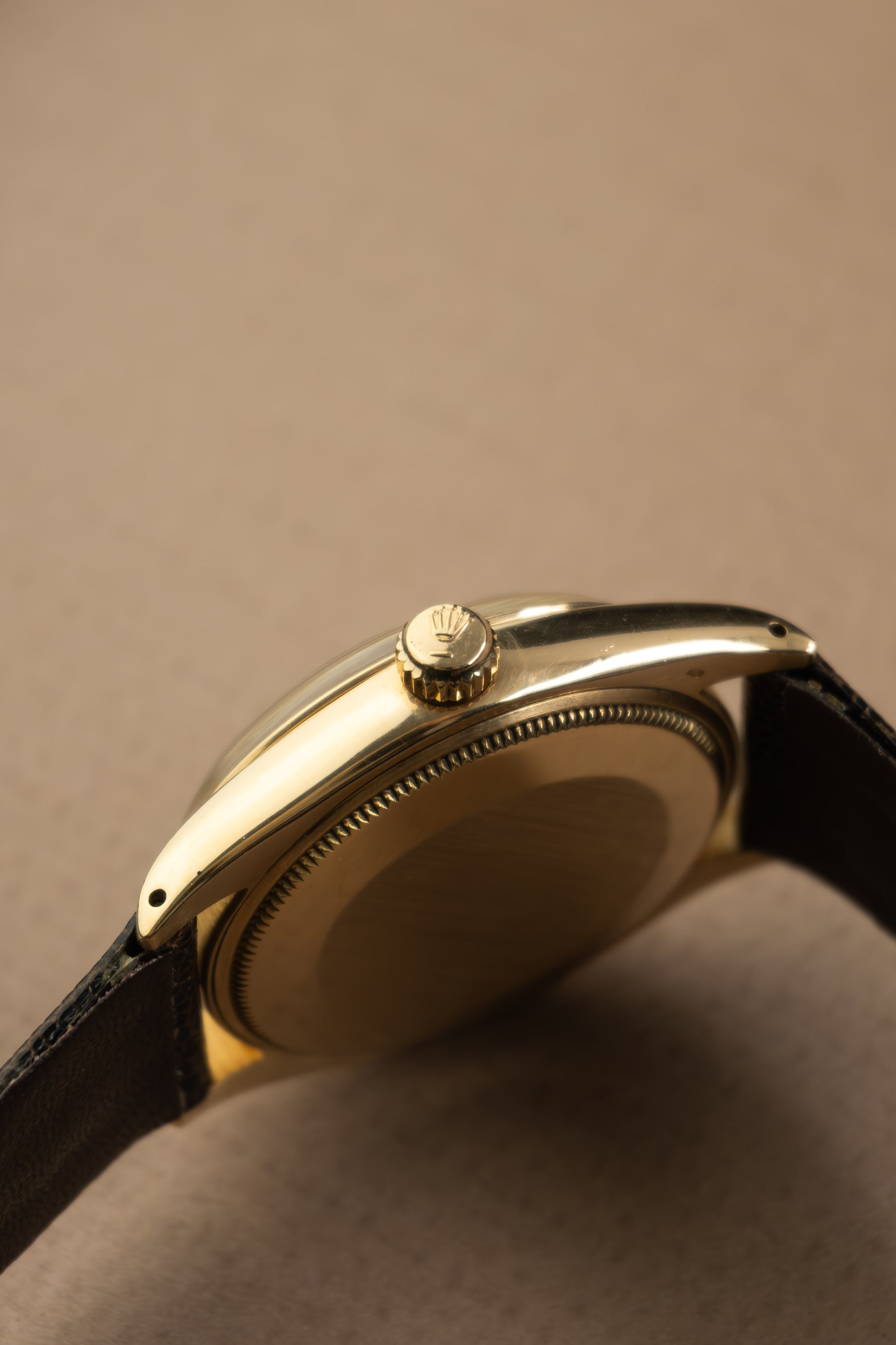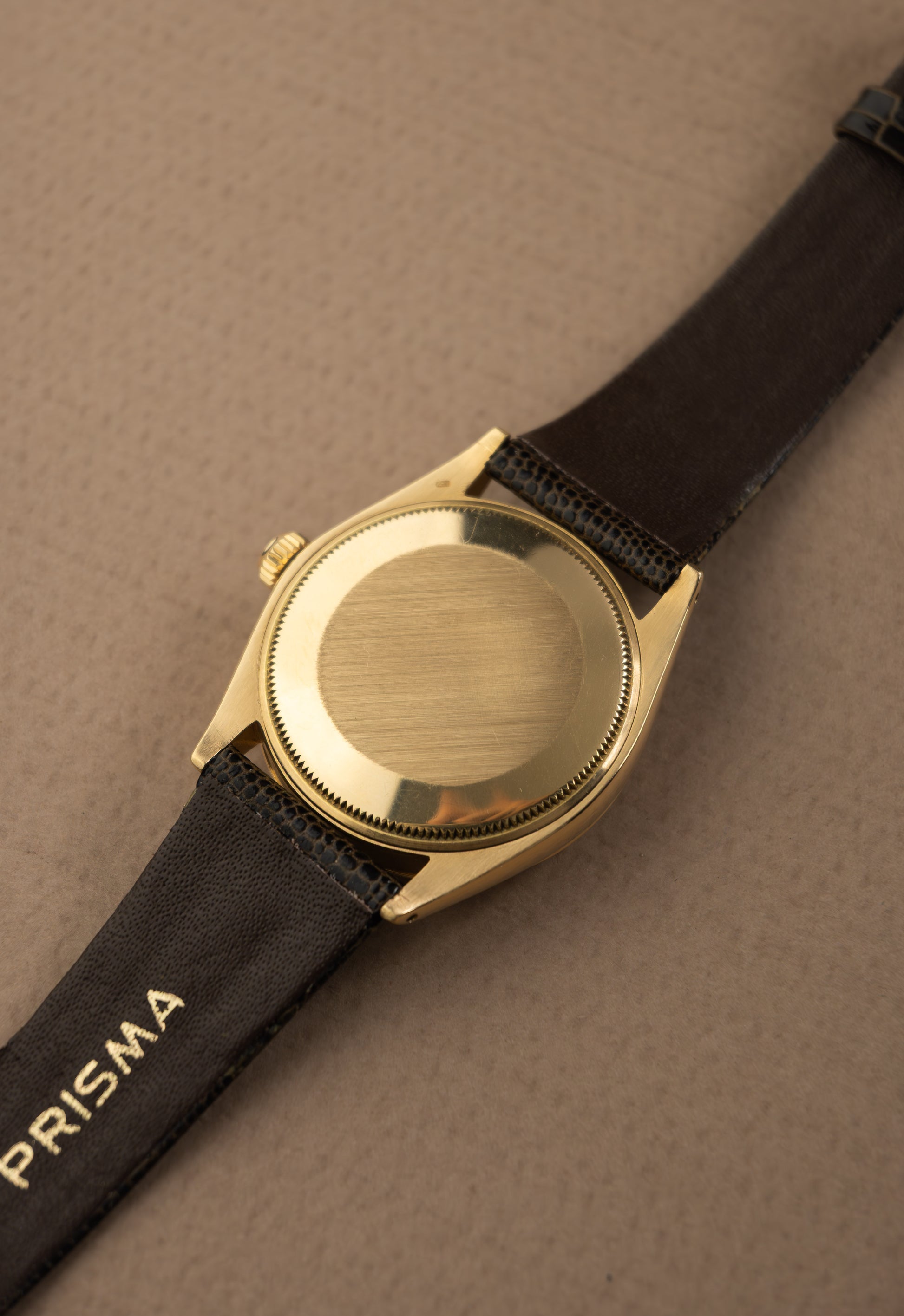 Deze ref. 1005 combineert de 34 mm 18k geel gouden Oyster kast, lederen band en zilveren wijzerplaat. We zien de wijzerplaat met gouden uurmarkeringen en goudkleurige dauphine stijl wijzers wat het nog meer uitgesproken maakt.
