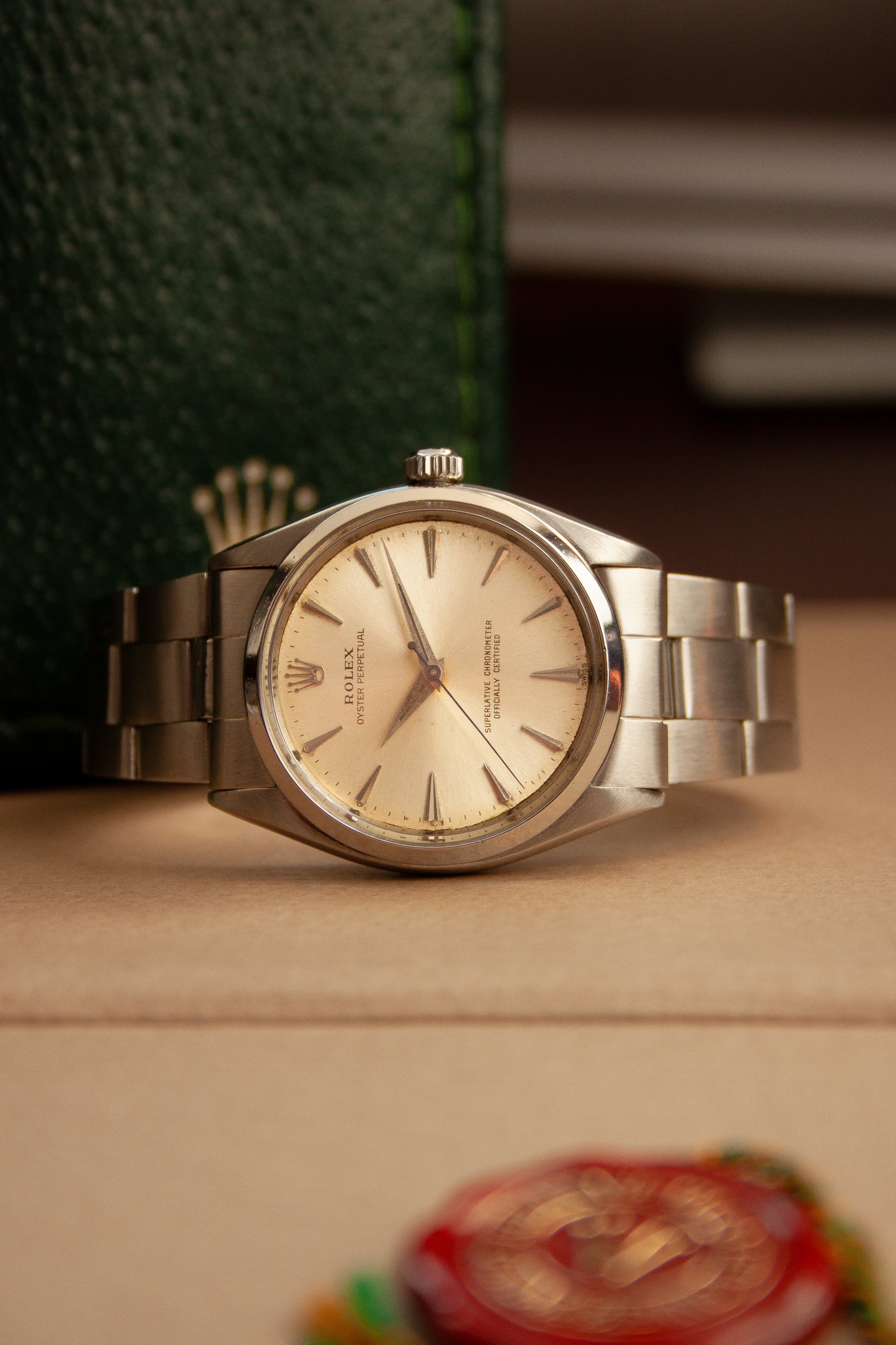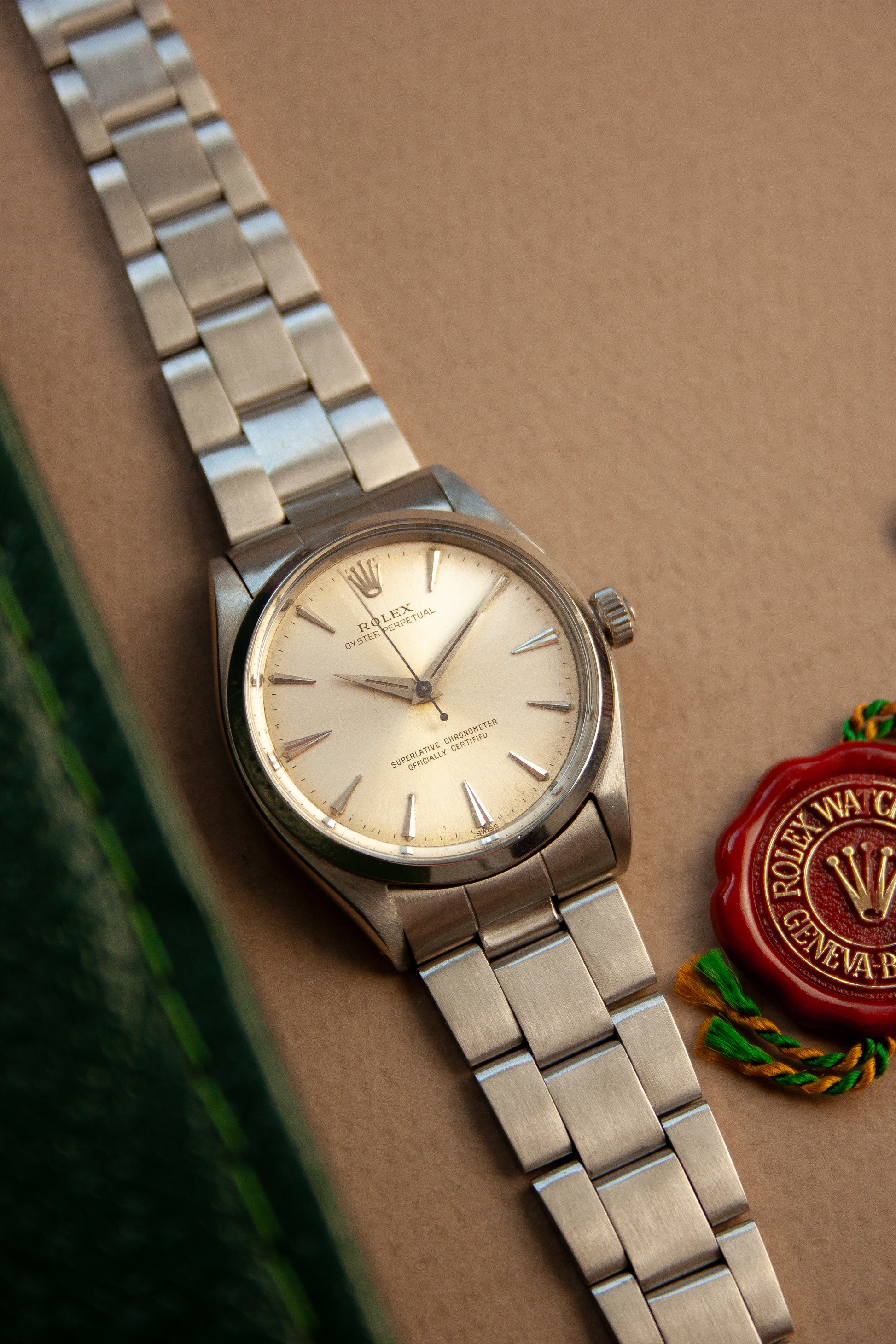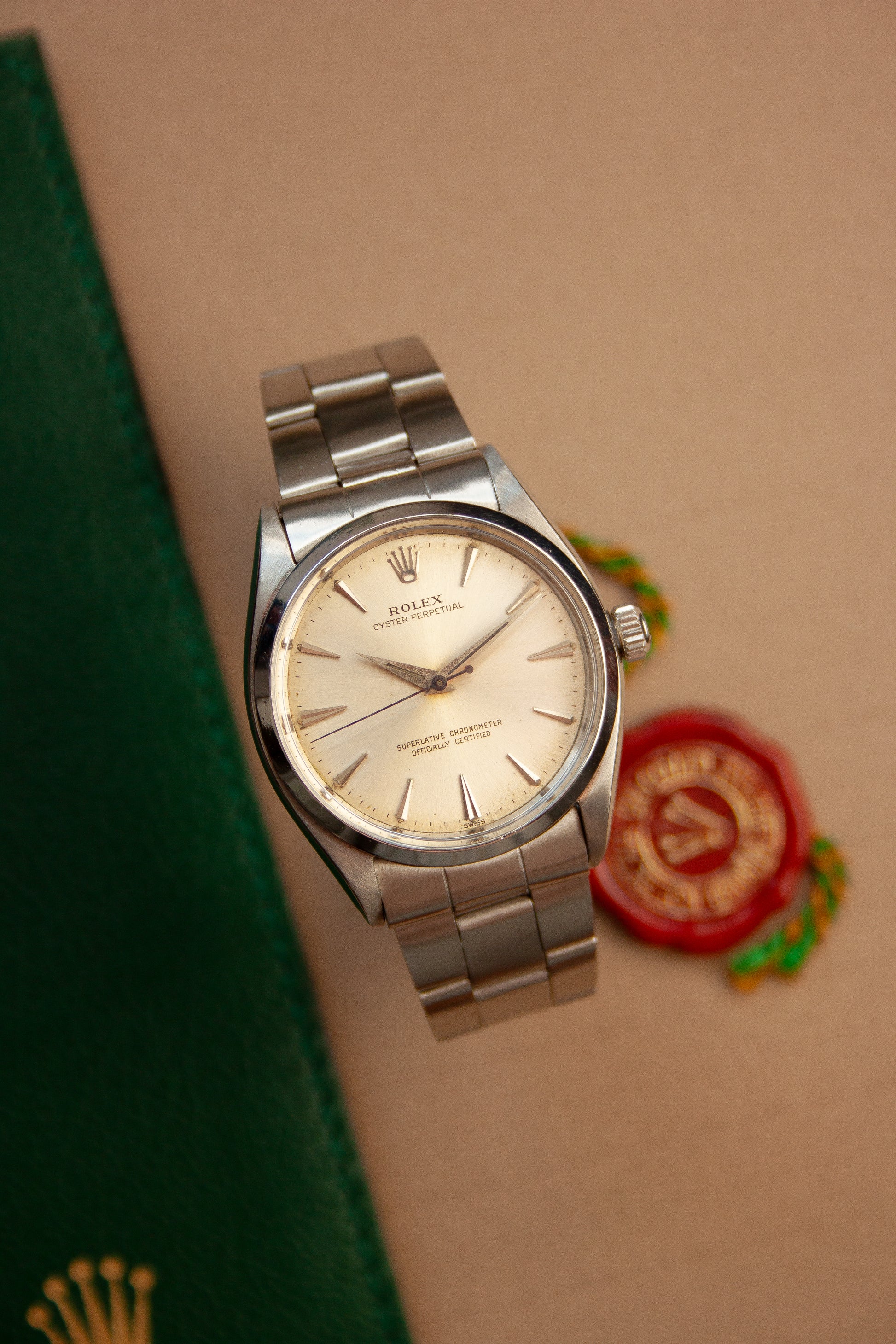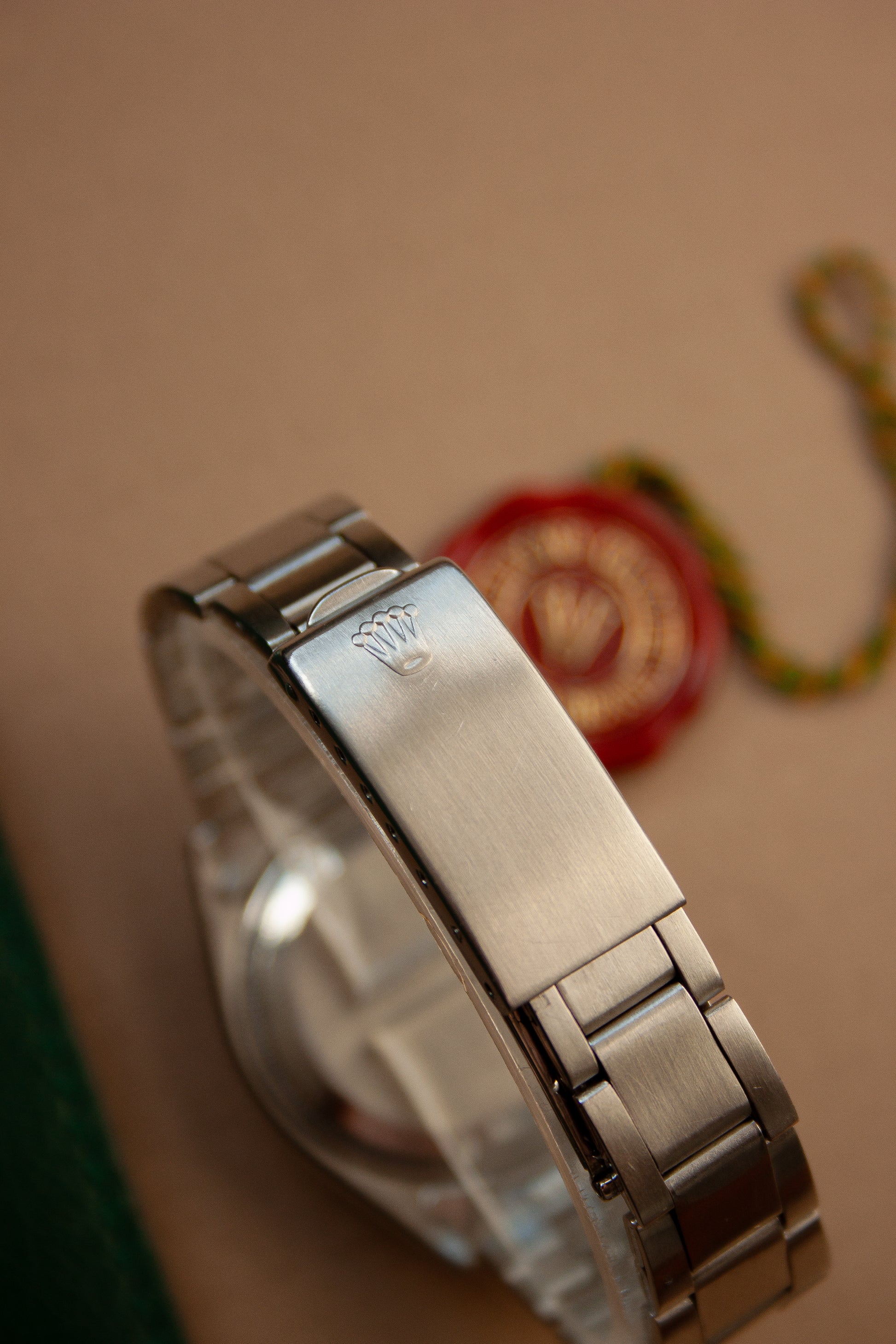 Deze ref. 6564 combineert de 34 mm Oyster stalen kast, Oyster band en zilver kleurige wijzerplaat. We zien de wijzerplaat met klauw uurmarkeringen en stalen dauphine stijl wijzers. Wat het nog meer uitgesproken maakt is de stalen smooth bezel