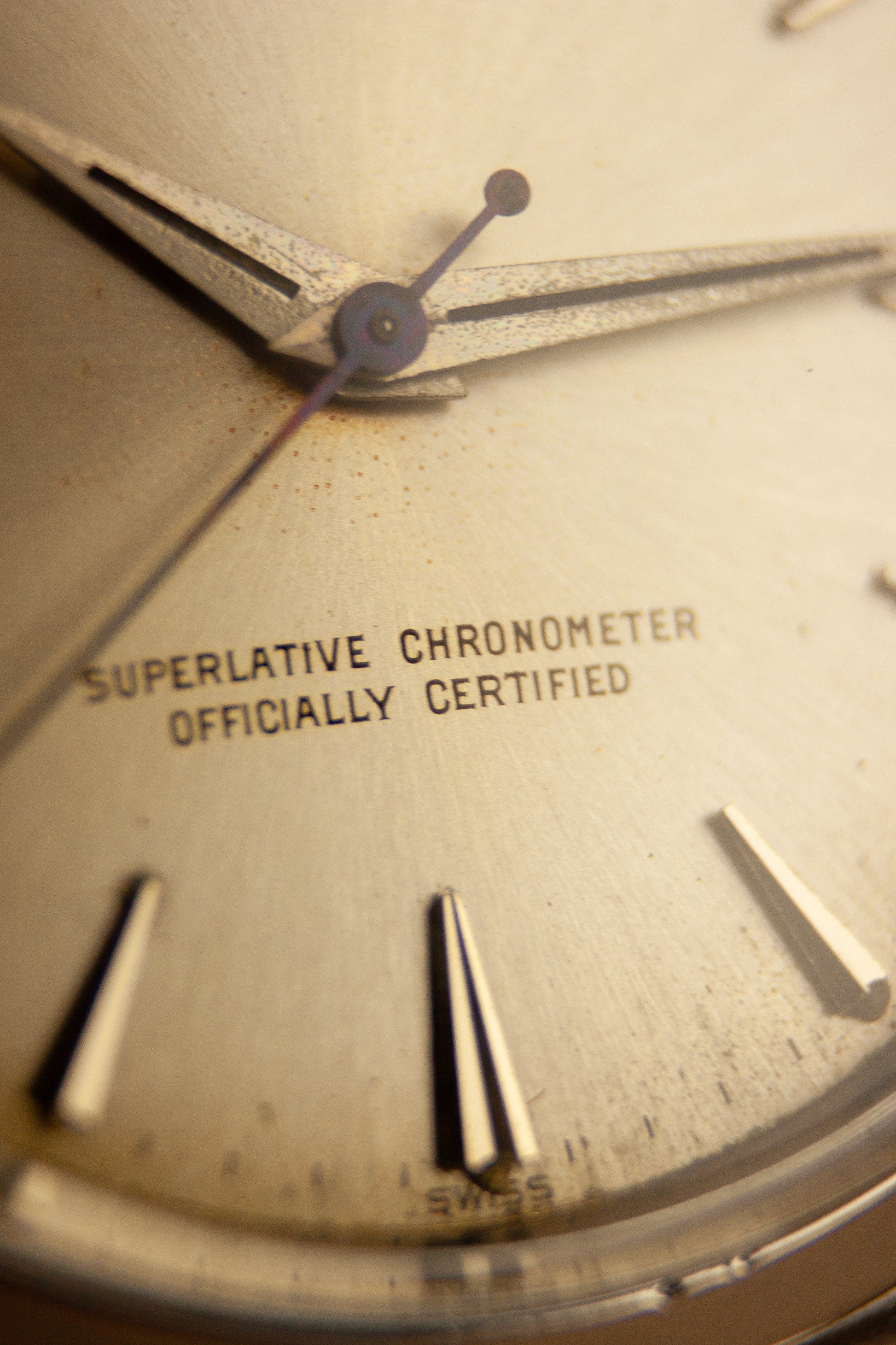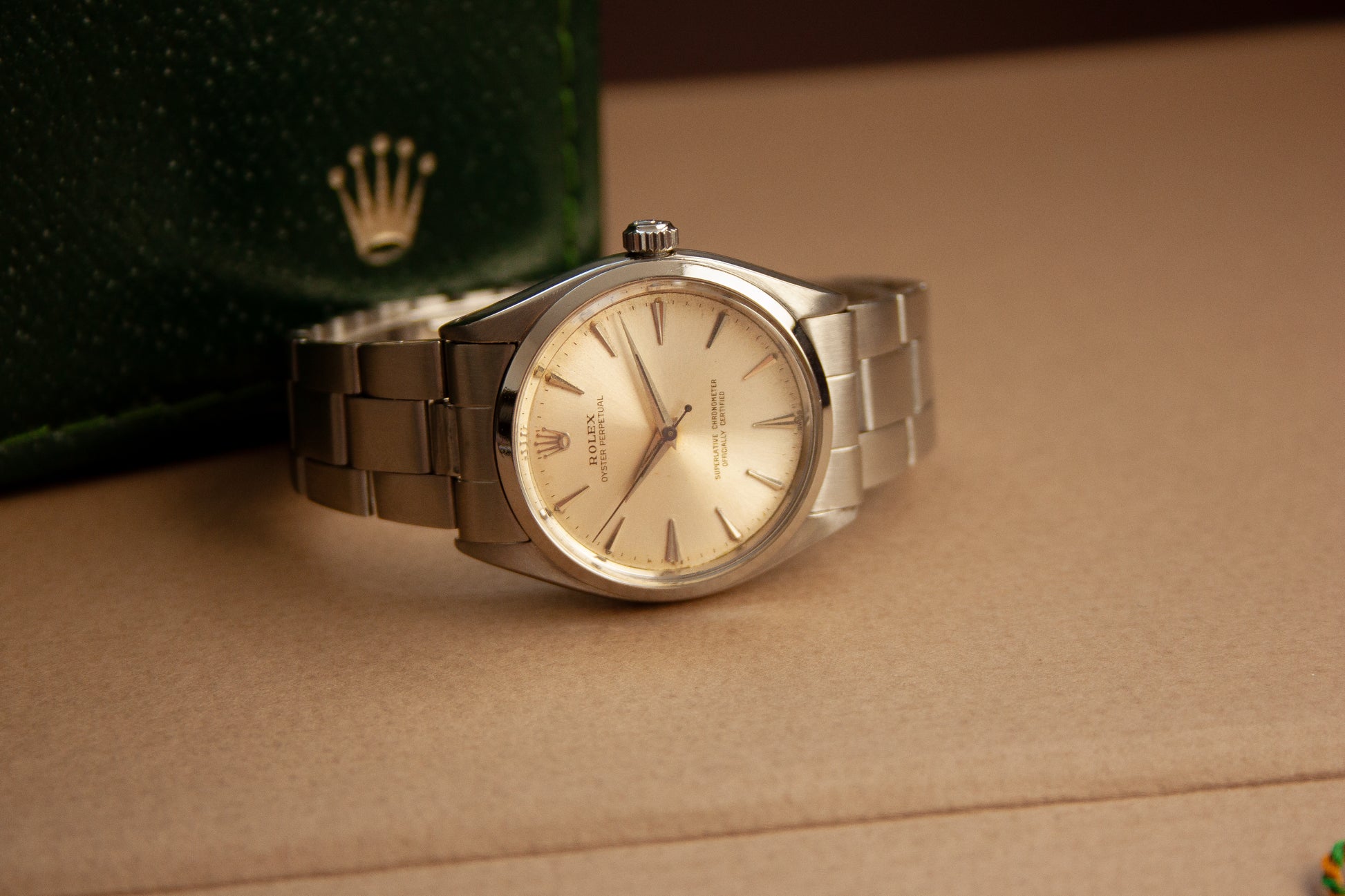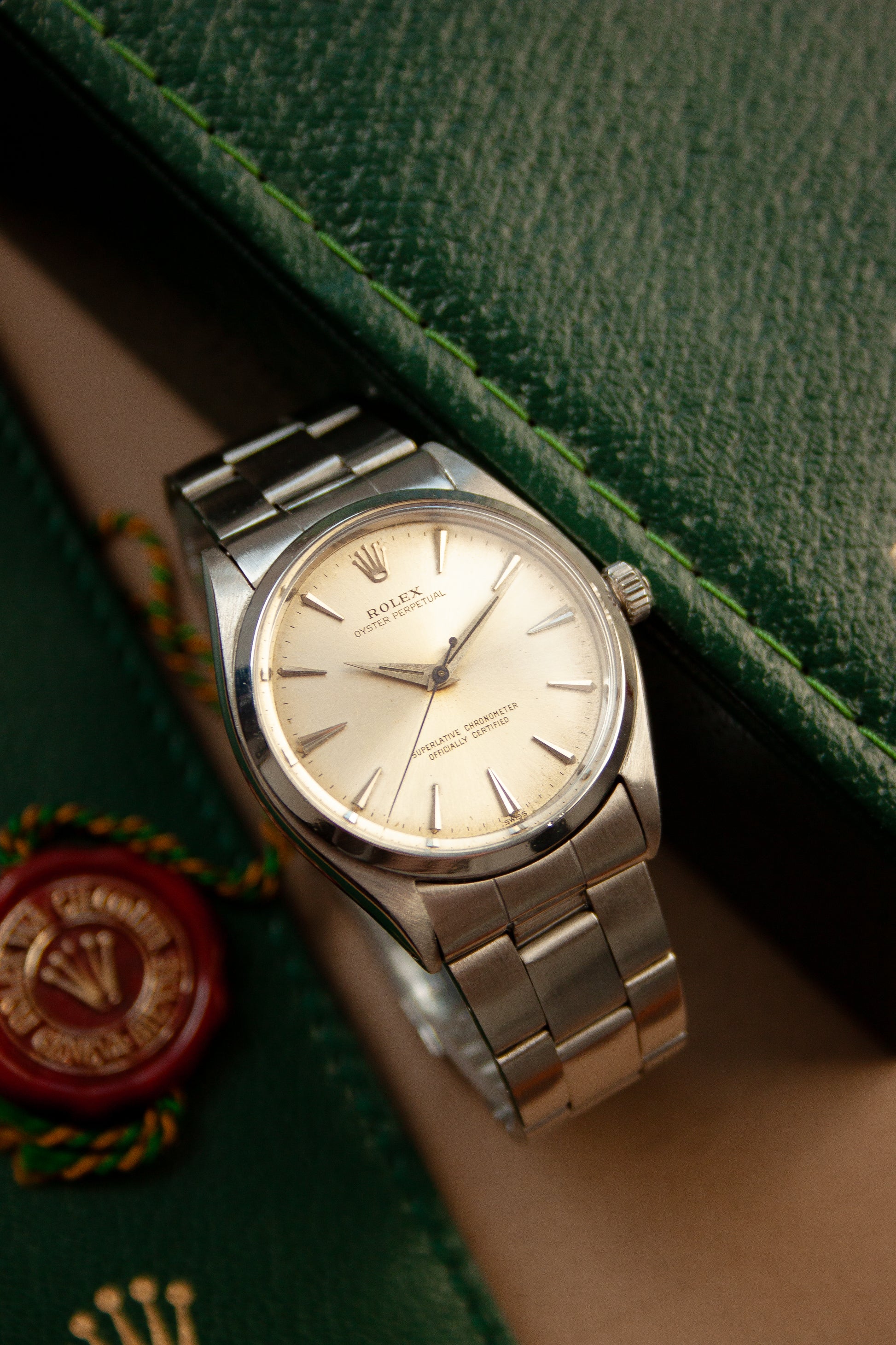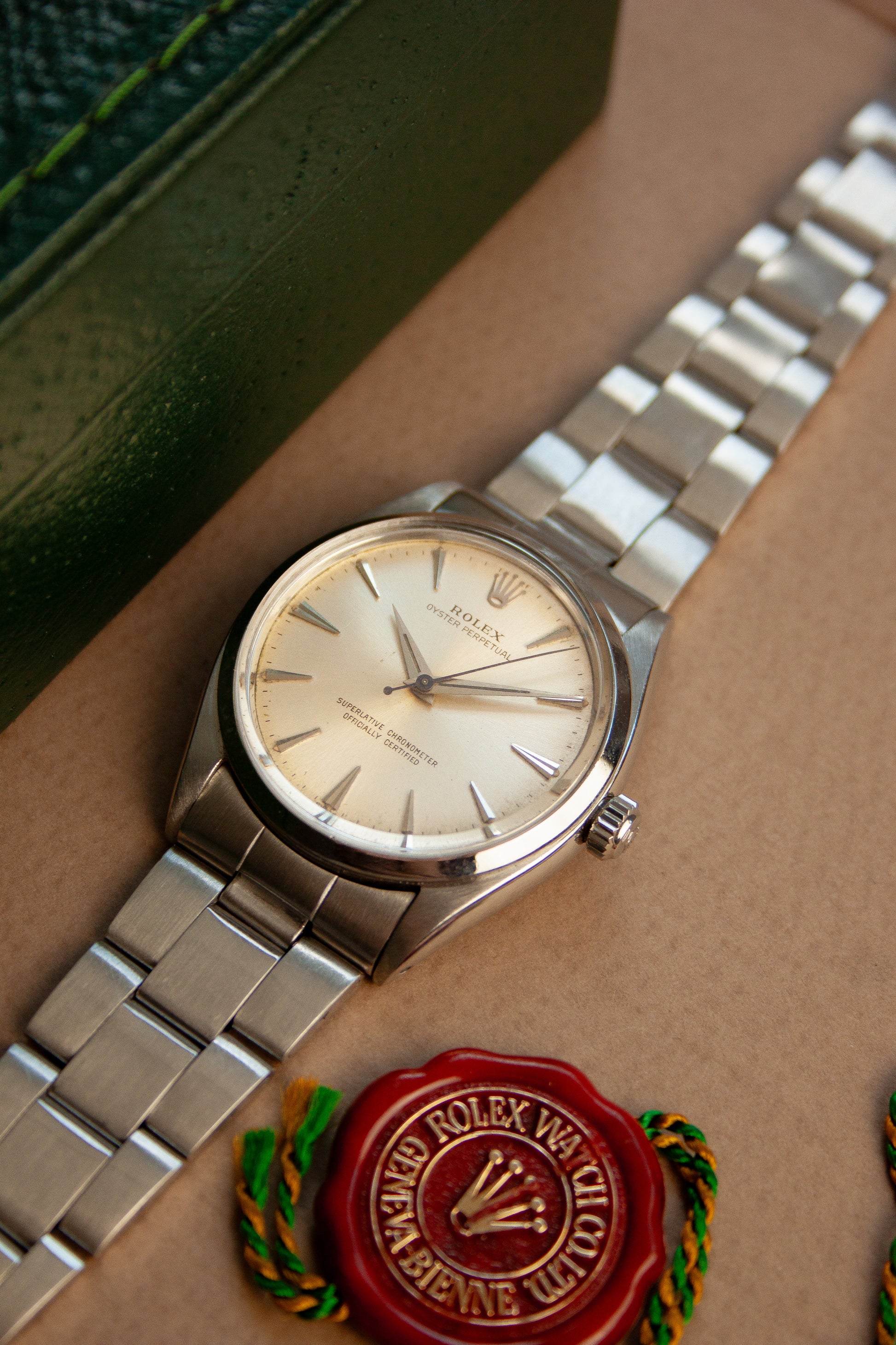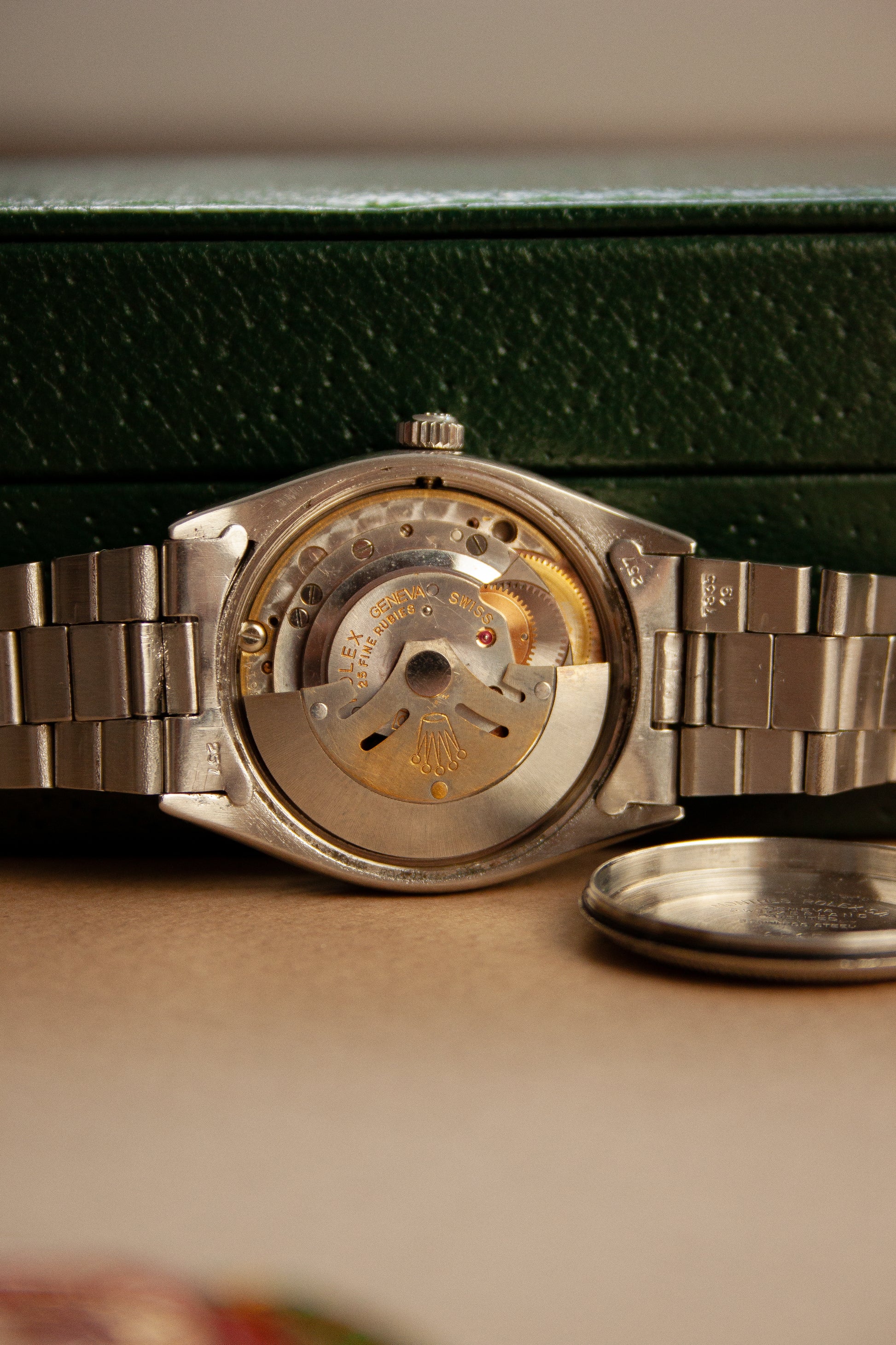 Deze ref. 6564 combineert de 34 mm Oyster stalen kast, Oyster band en zilver kleurige wijzerplaat. We zien de wijzerplaat met klauw uurmarkeringen en stalen dauphine stijl wijzers. Wat het nog meer uitgesproken maakt is de stalen smooth bezel