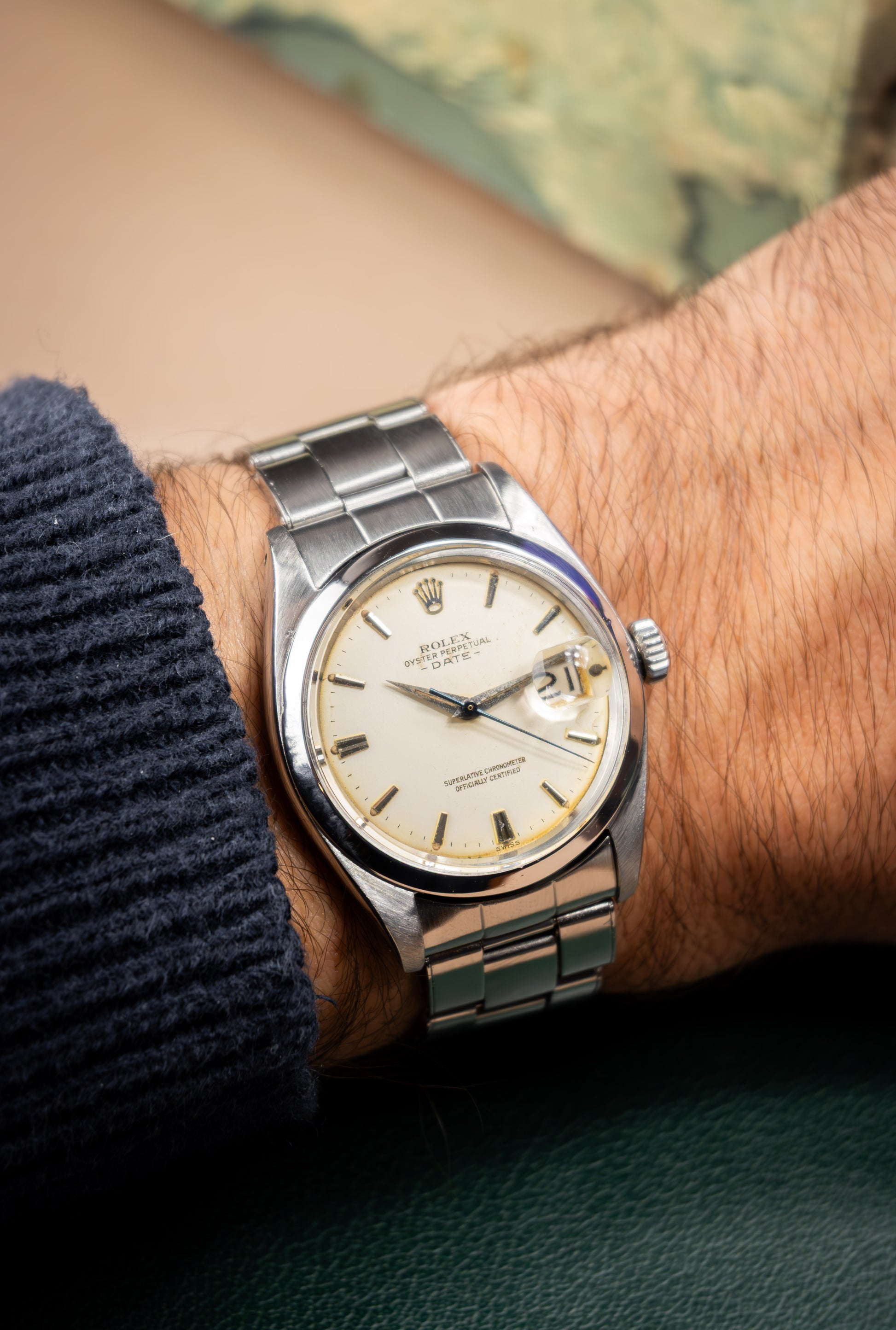 Deze ref. 1500 combineert de 34 mm Oyster stalen kast, Oyster band en creme kleurige wijzerplaat. We zien de wijzerplaat met stalen uurmarkeringen en stalen dauphine stijl wijzers. Wat het nog meer uitgesproken maakt.