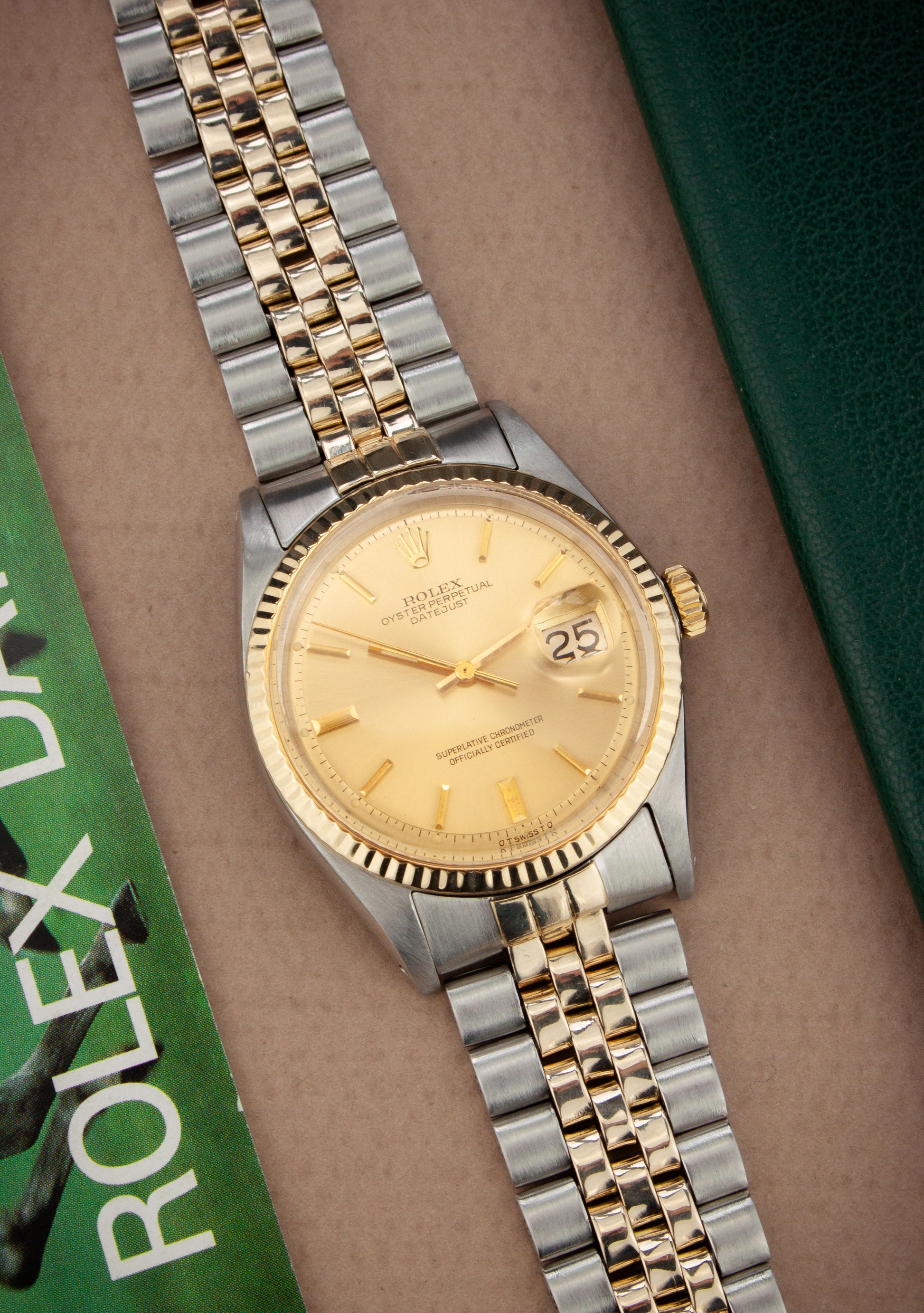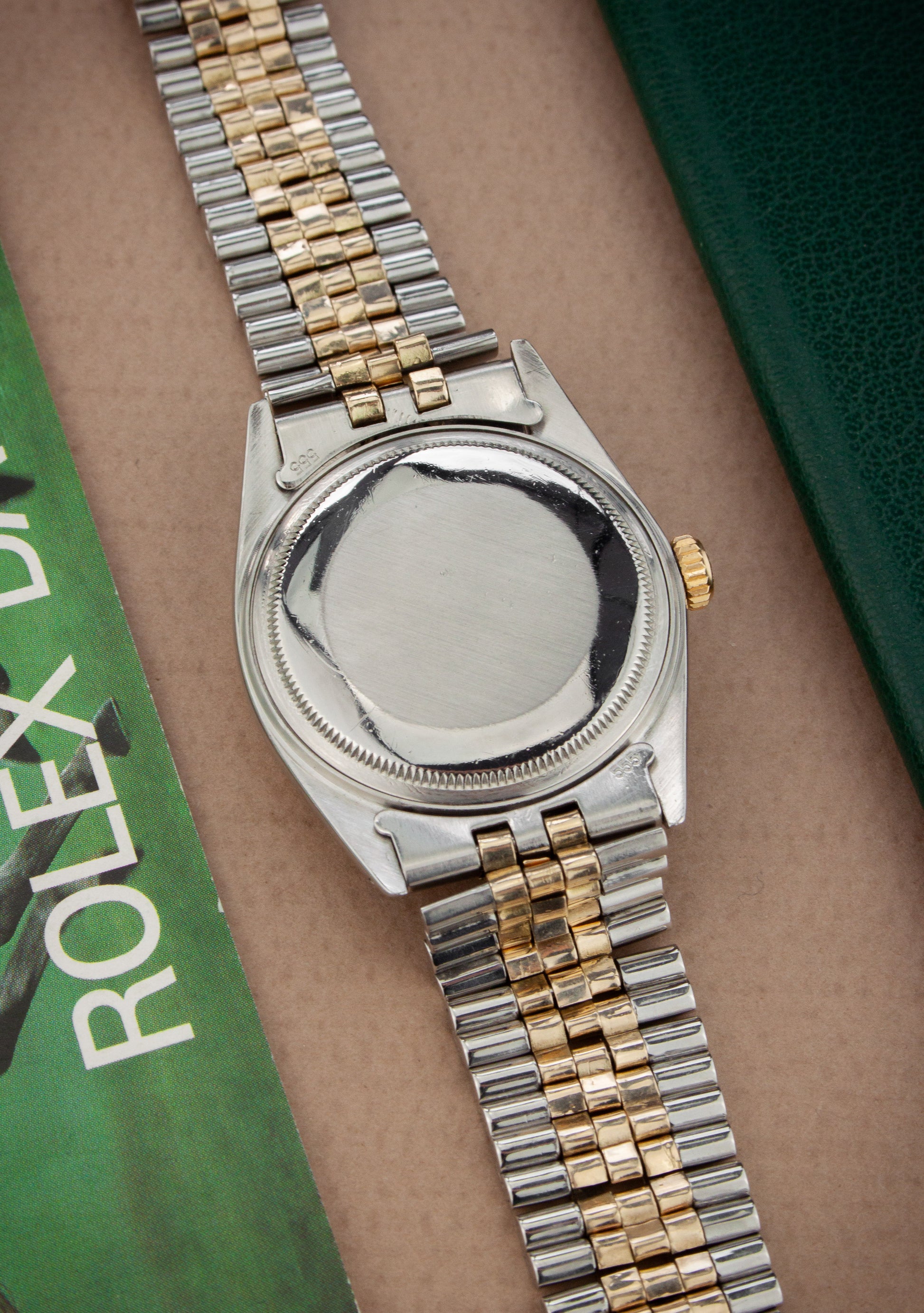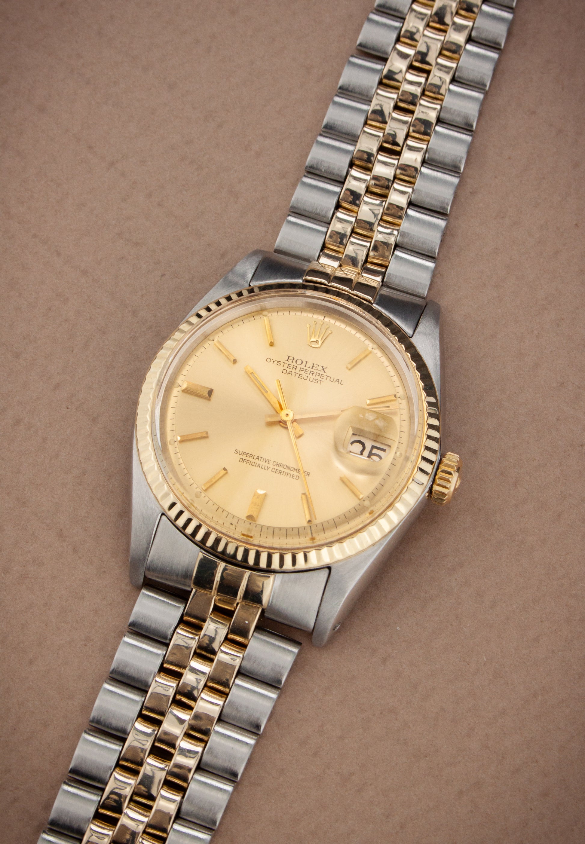 Deze ref. 1601 combineert de 36 mm Oyster stalen kast, 18k yellow gold two tone Jubilee band en champagne kleurige sigma wijzerplaat. We zien de wijzerplaat met 18k gouden uurmarkeringen en goud gekleurde wijzers. Wat het nog meer uitgesproken maakt is de 18k geel gouden Fluted bezel.