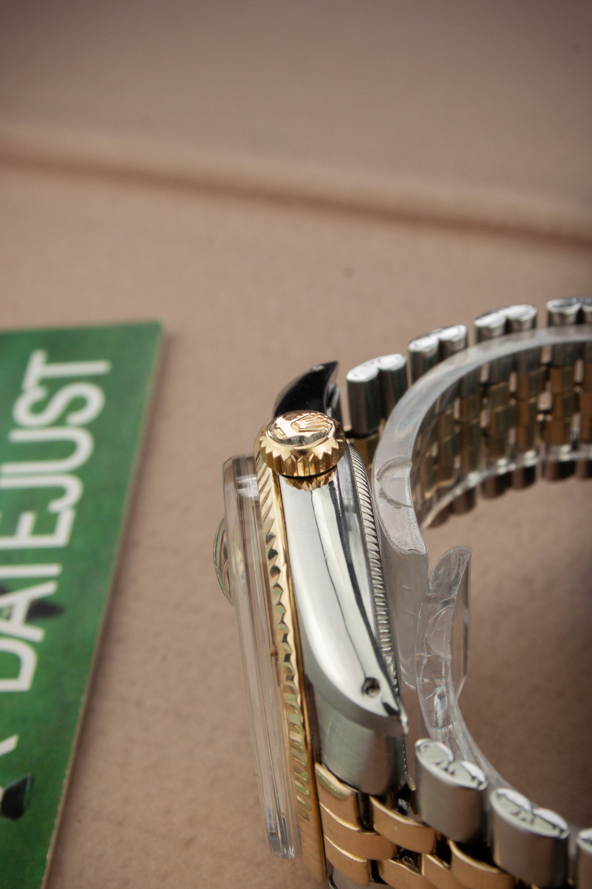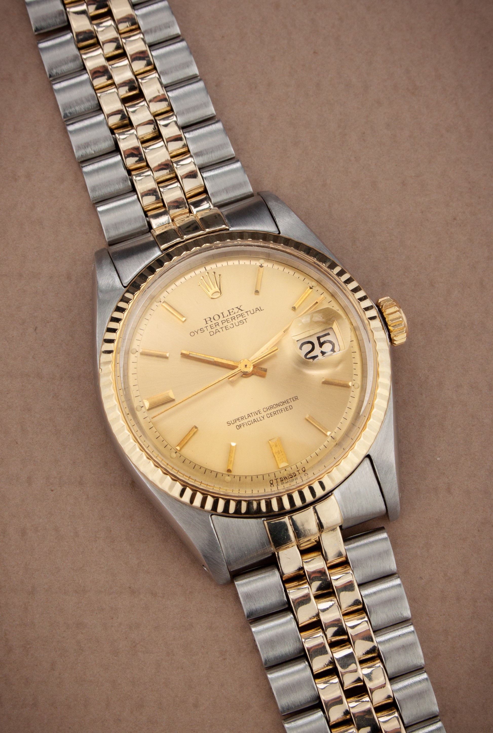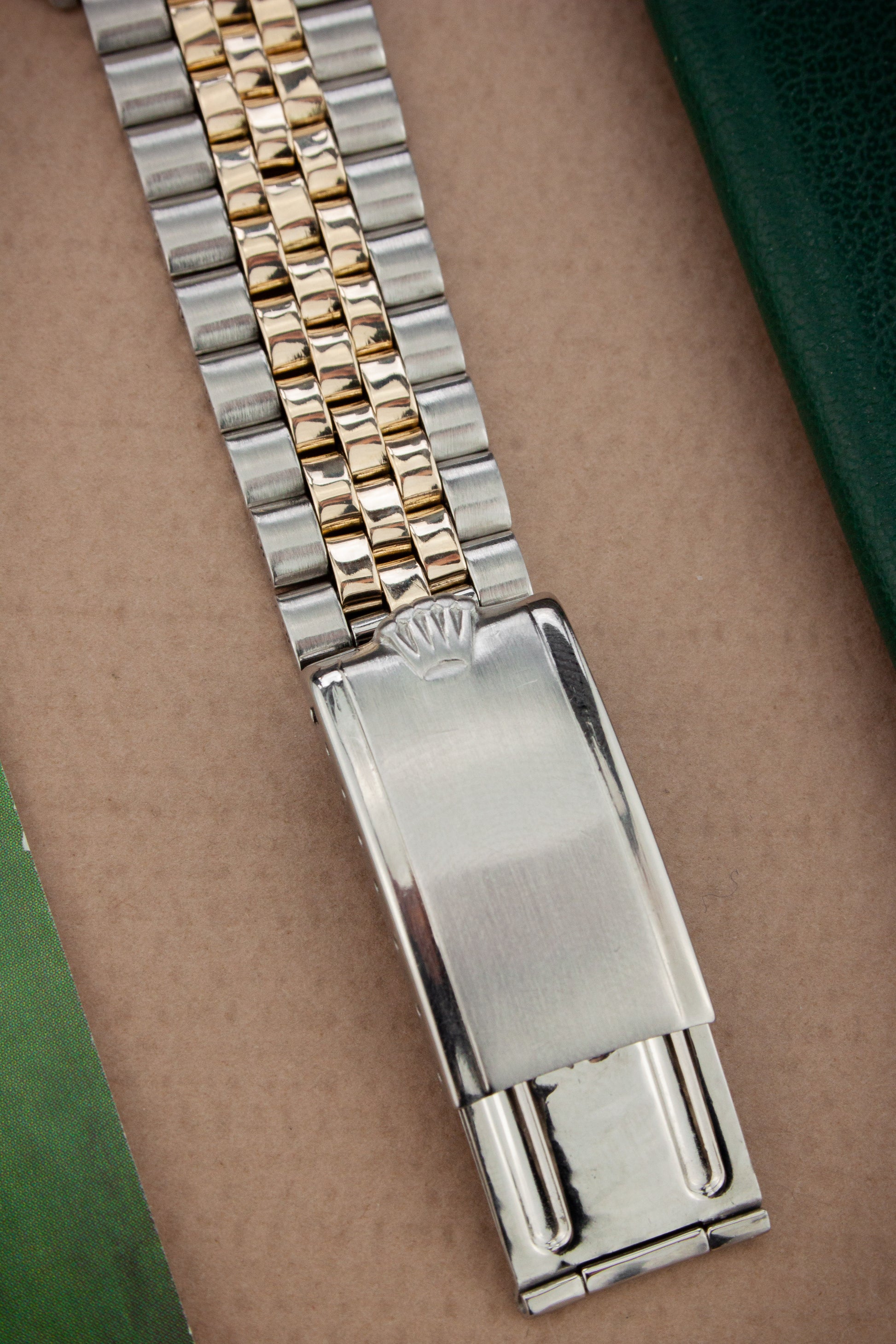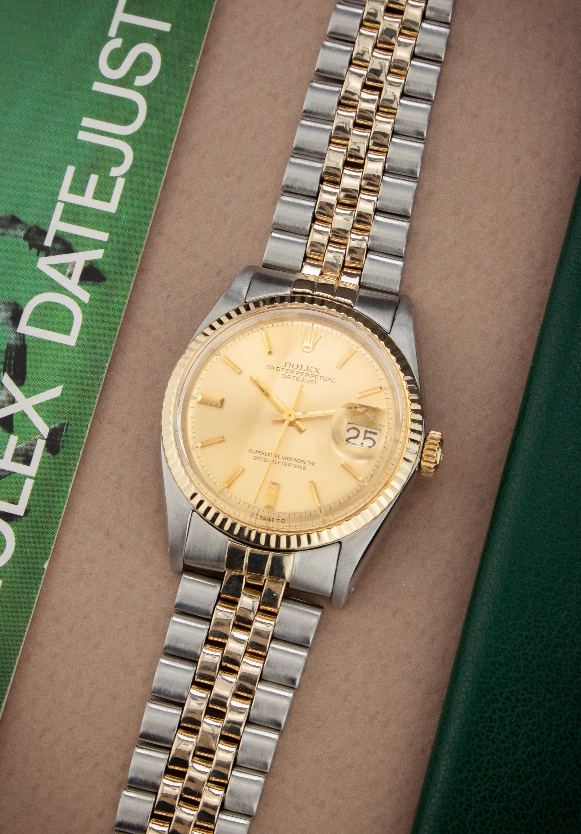 Deze ref. 1601 combineert de 36 mm Oyster stalen kast, 18k yellow gold two tone Jubilee band en champagne kleurige sigma wijzerplaat. We zien de wijzerplaat met 18k gouden uurmarkeringen en goud gekleurde wijzers. Wat het nog meer uitgesproken maakt is de 18k geel gouden Fluted bezel.
