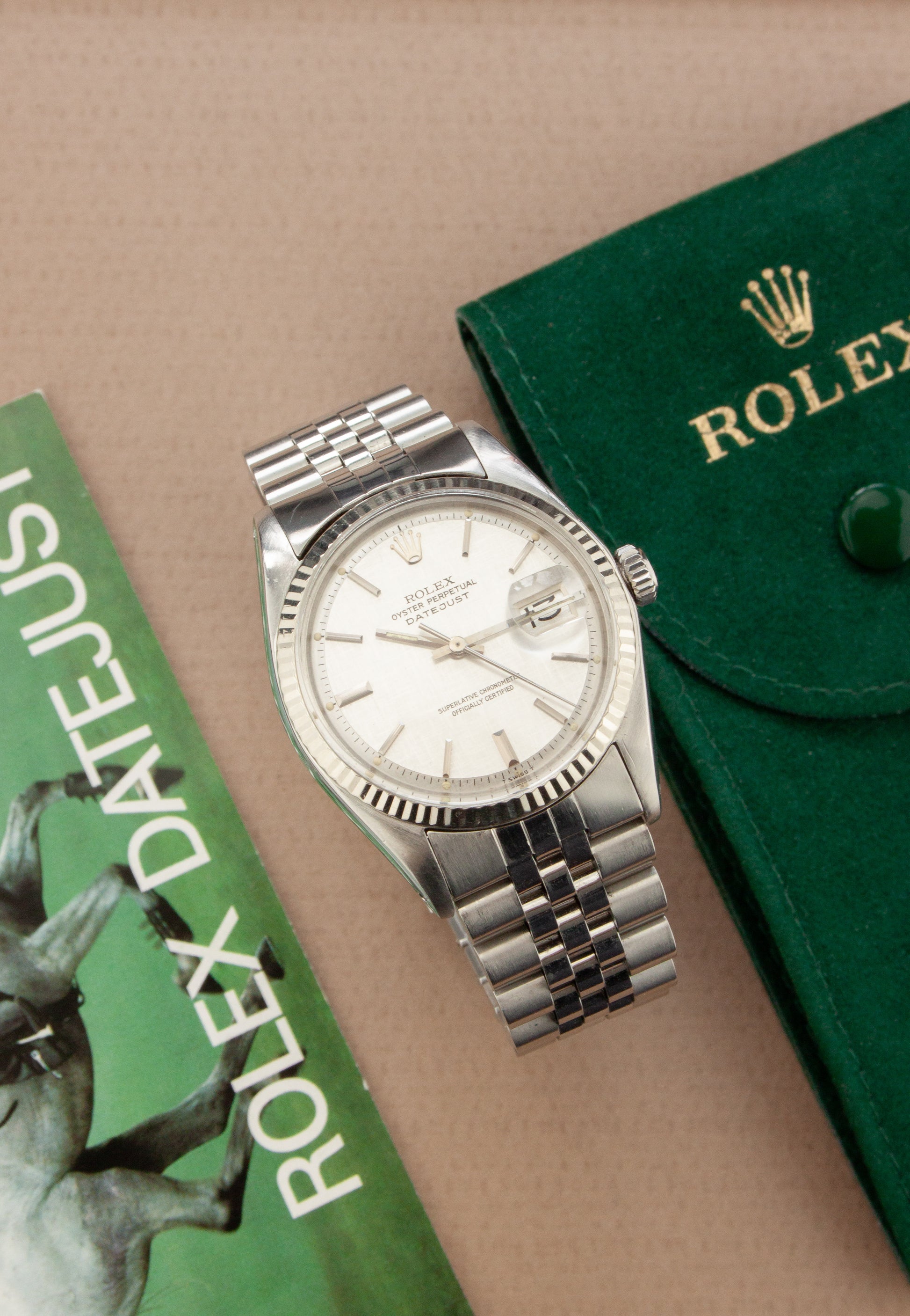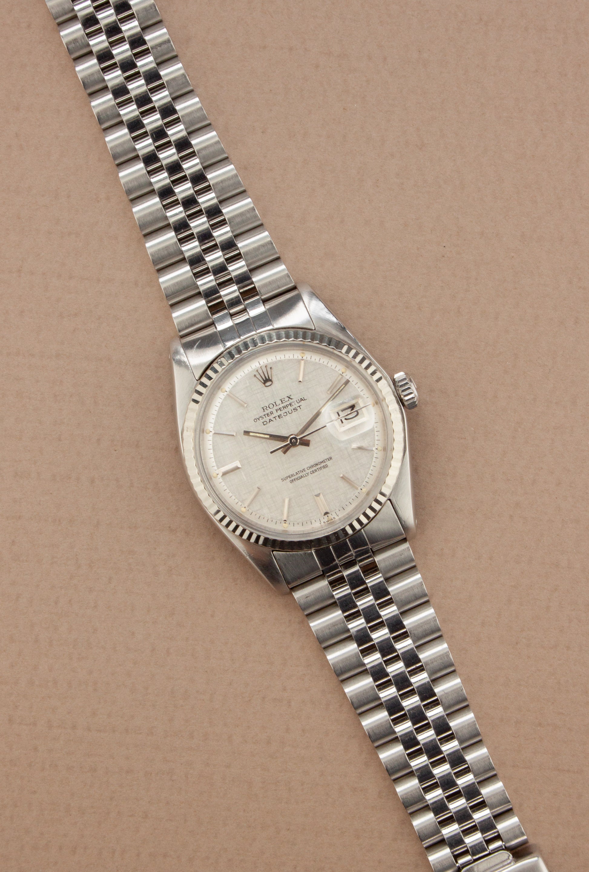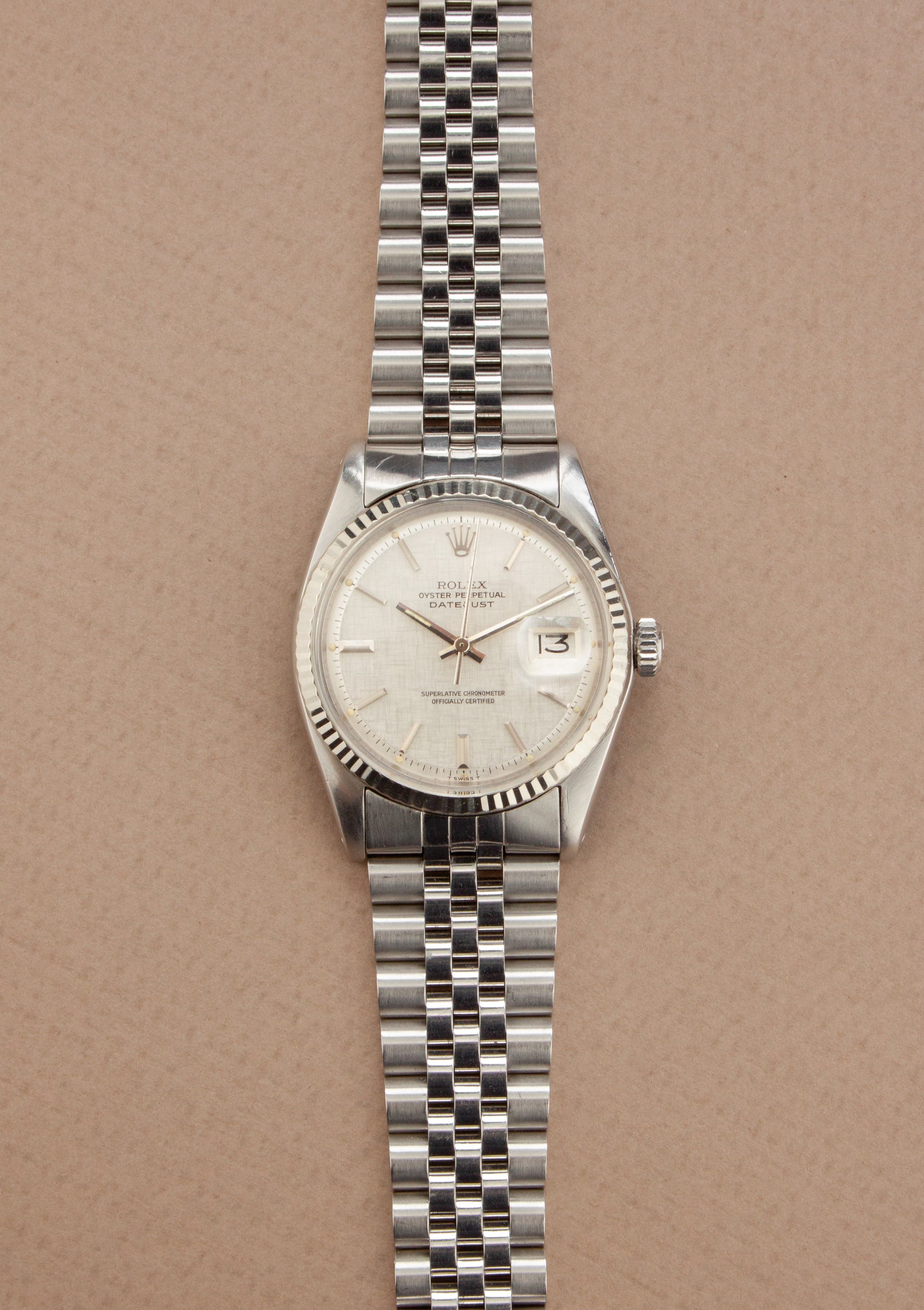 Deze ref. 1601 combineert de 36 mm Oyster stalen kast, witgouden fluted bezel, stalen jubilee band en zilver kleurige linen wijzerplaat. We zien de wijzerplaat met stalen uurmarkeringen en stalen wijzers, wat het nog meer uitgesproken maakt.