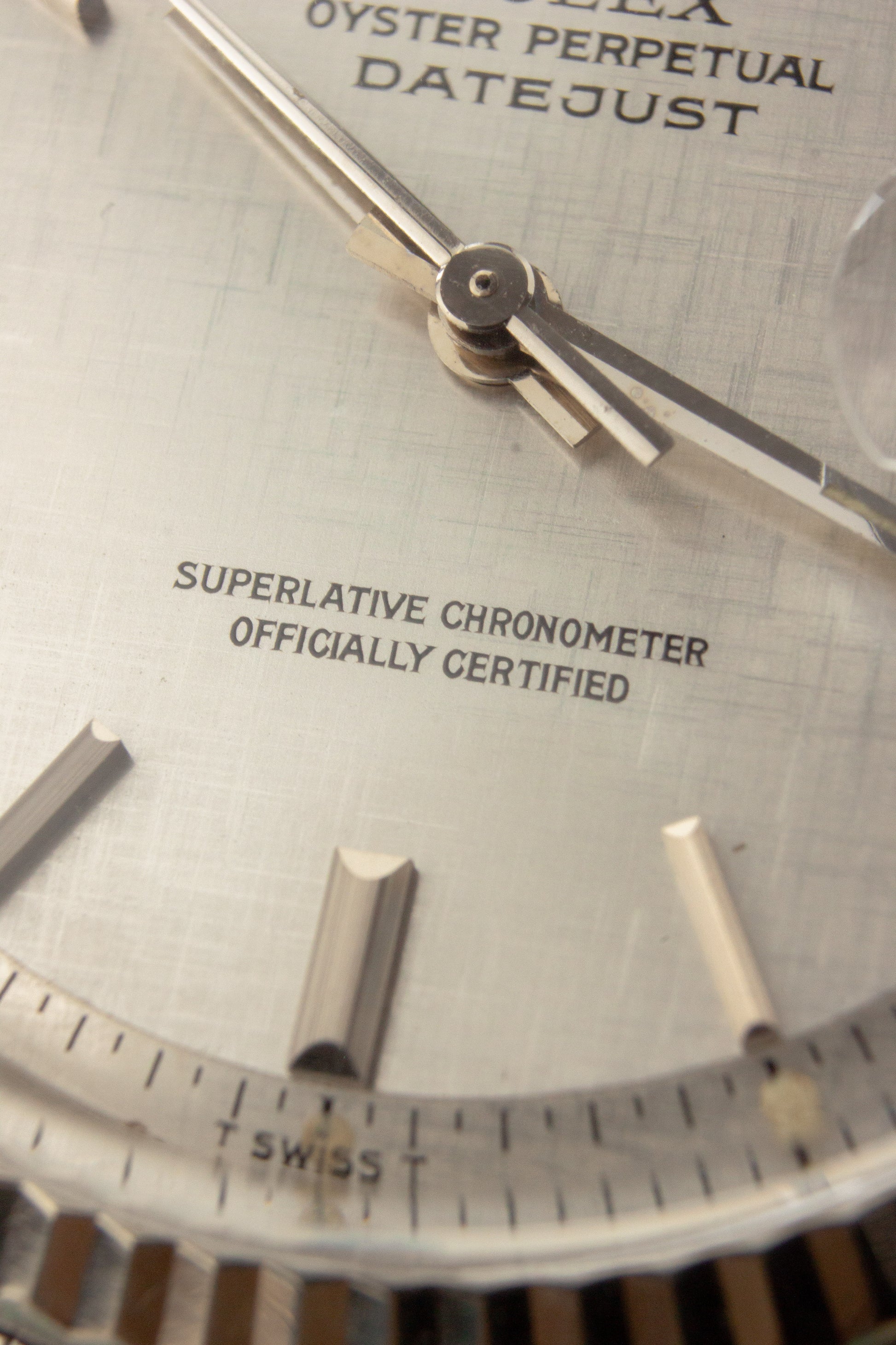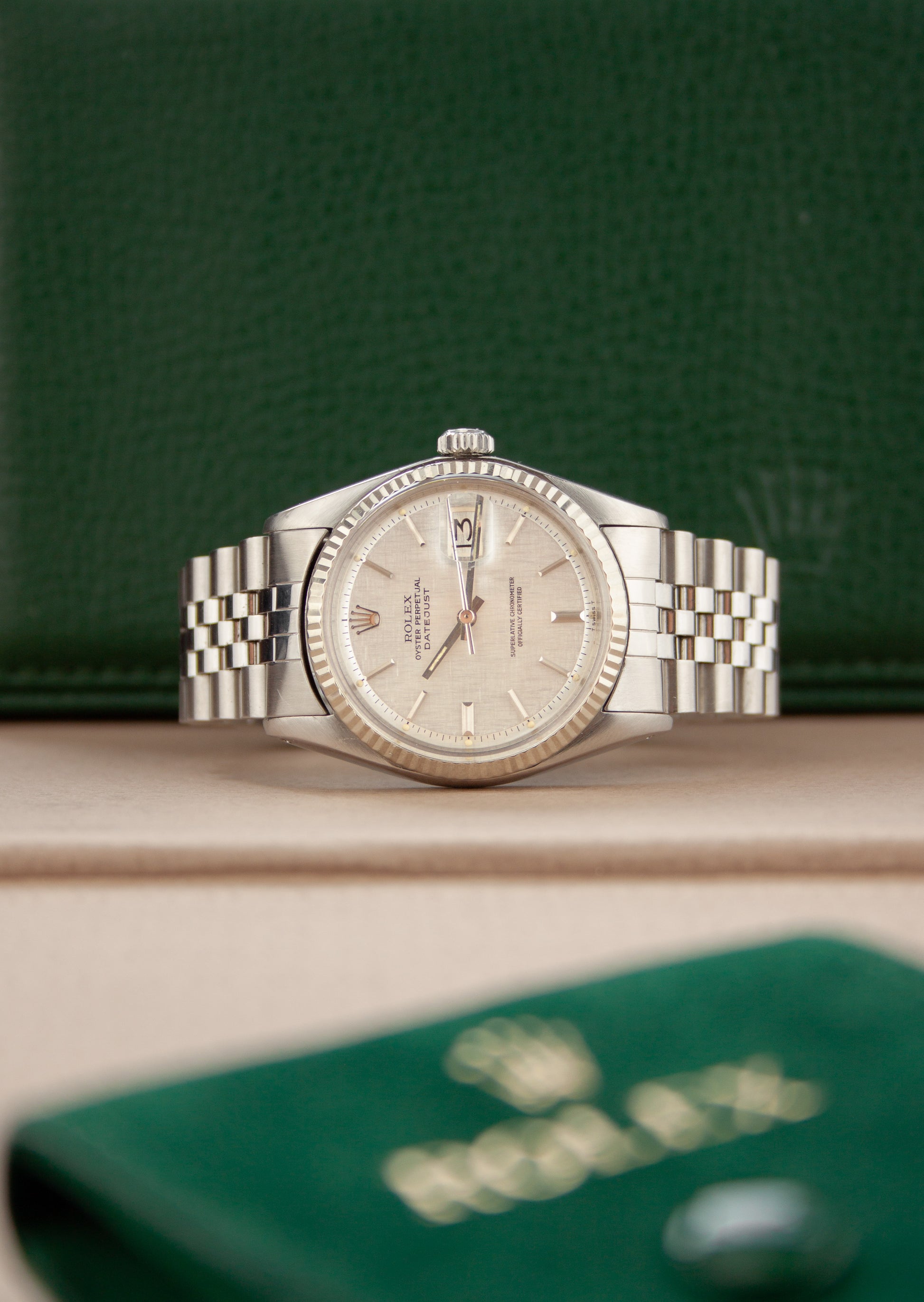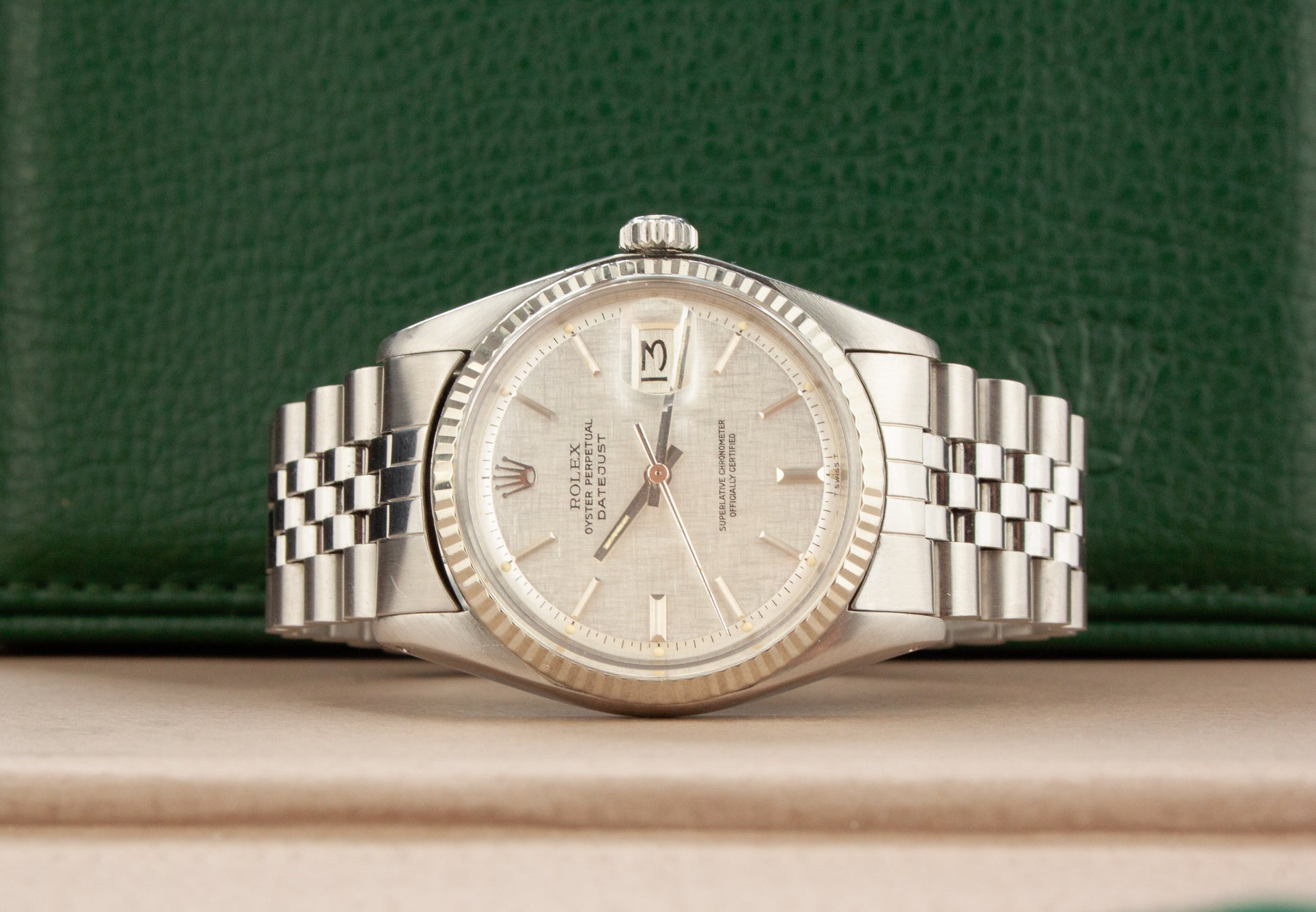 Deze ref. 1601 combineert de 36 mm Oyster stalen kast, witgouden fluted bezel, stalen jubilee band en zilver kleurige linen wijzerplaat. We zien de wijzerplaat met stalen uurmarkeringen en stalen wijzers, wat het nog meer uitgesproken maakt.