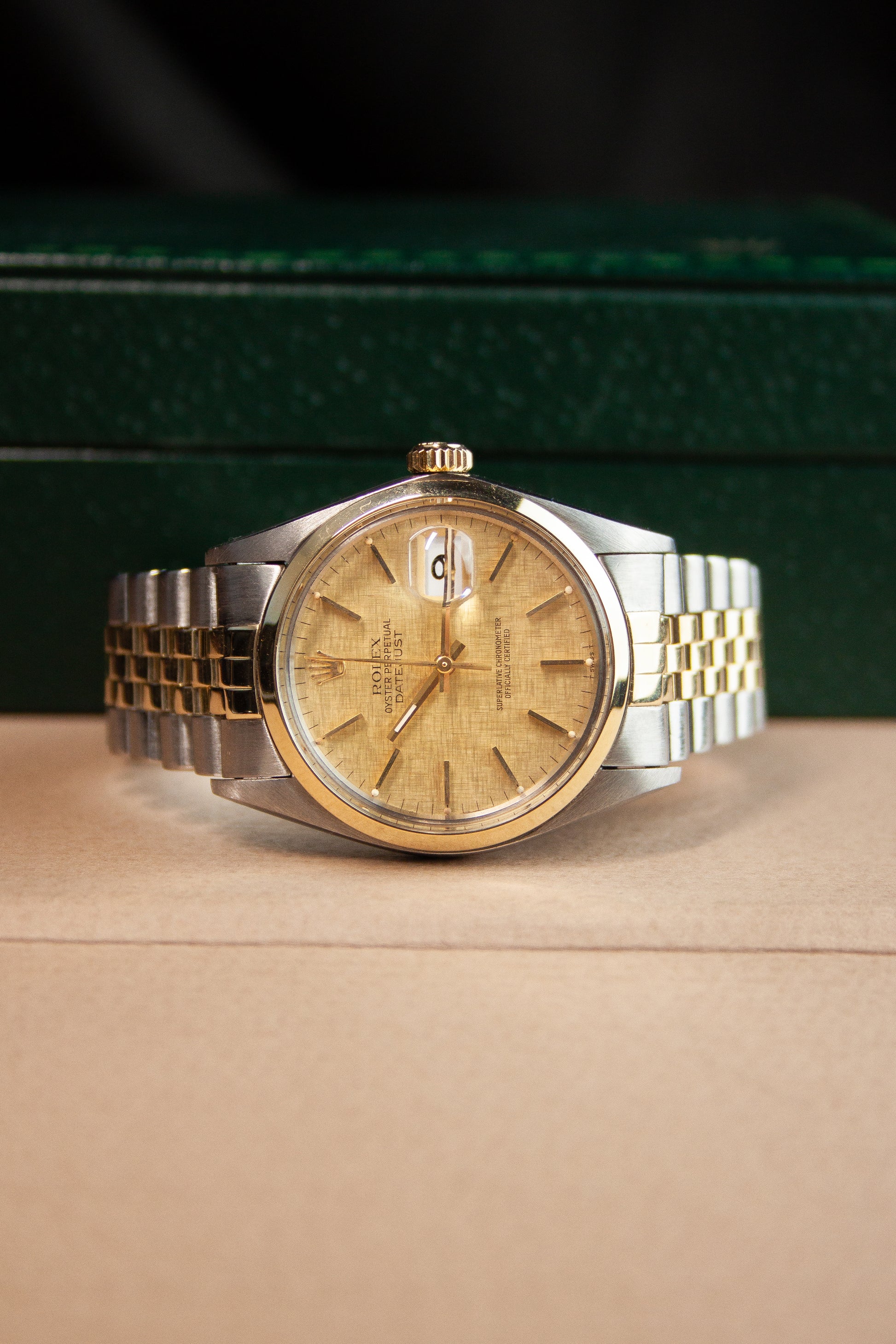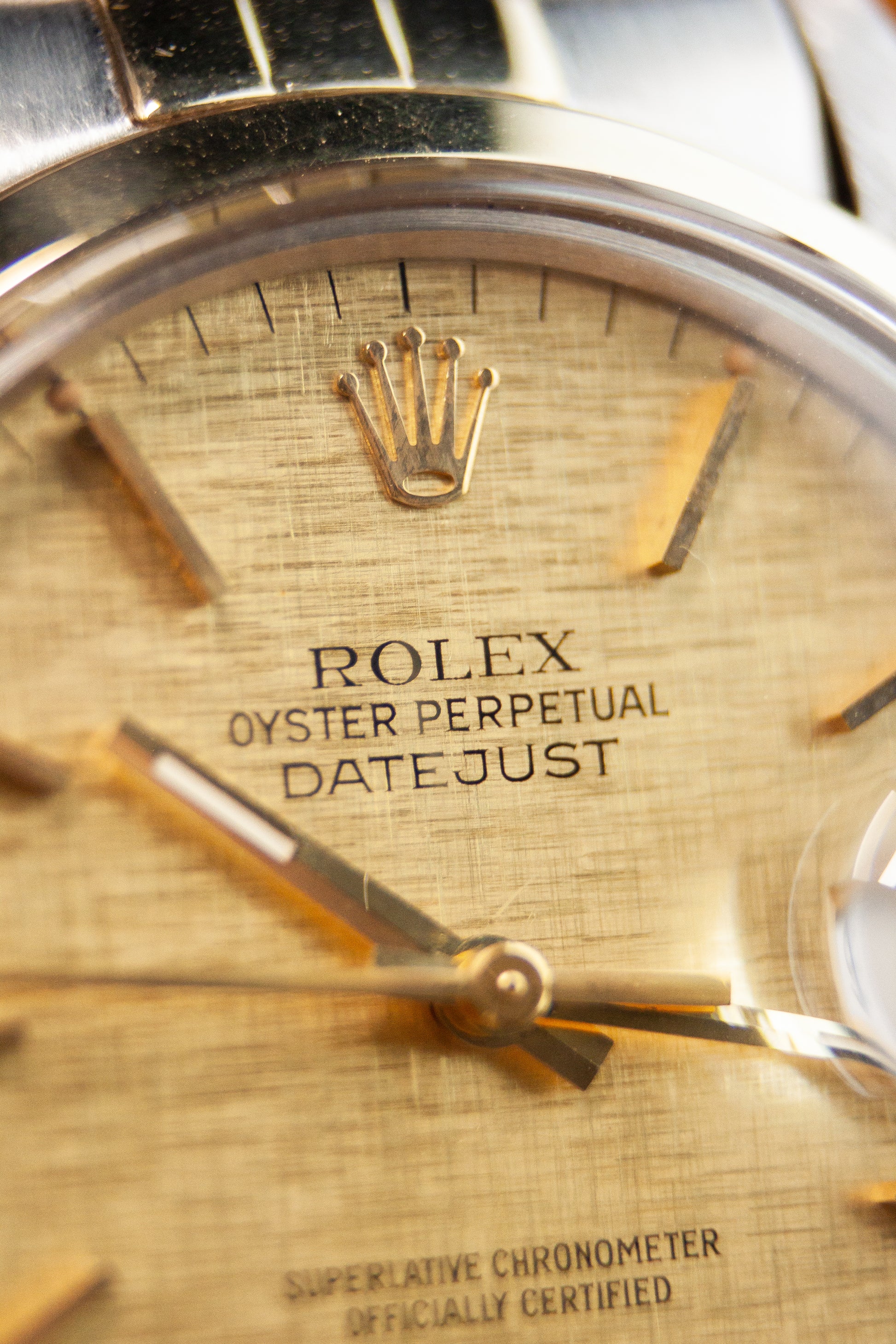 Deze ref. 16003 combineert de 36 mm Oyster stalen kast, 18k yellow gold two tone Jubilee band en champagne kleurige linen wijzerplaat. We zien de wijzerplaat met goudkleurige uurmarkeringen en goud gekleurde wijzers. Wat het nog meer uitgesproken maakt is de 18k geel gouden smooth bezel.