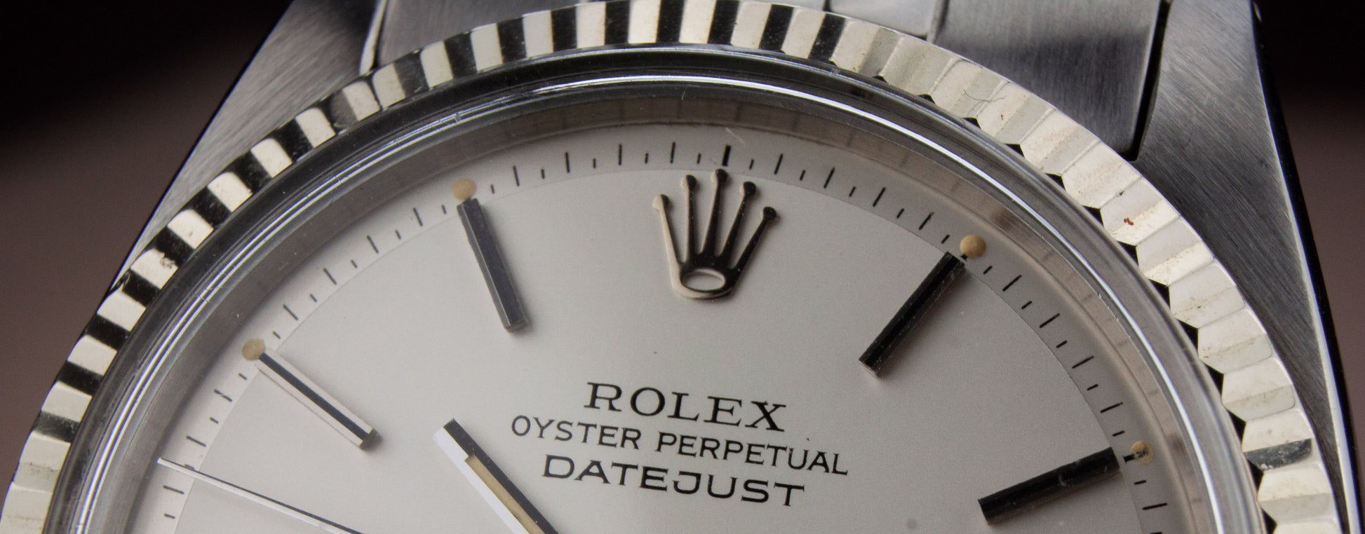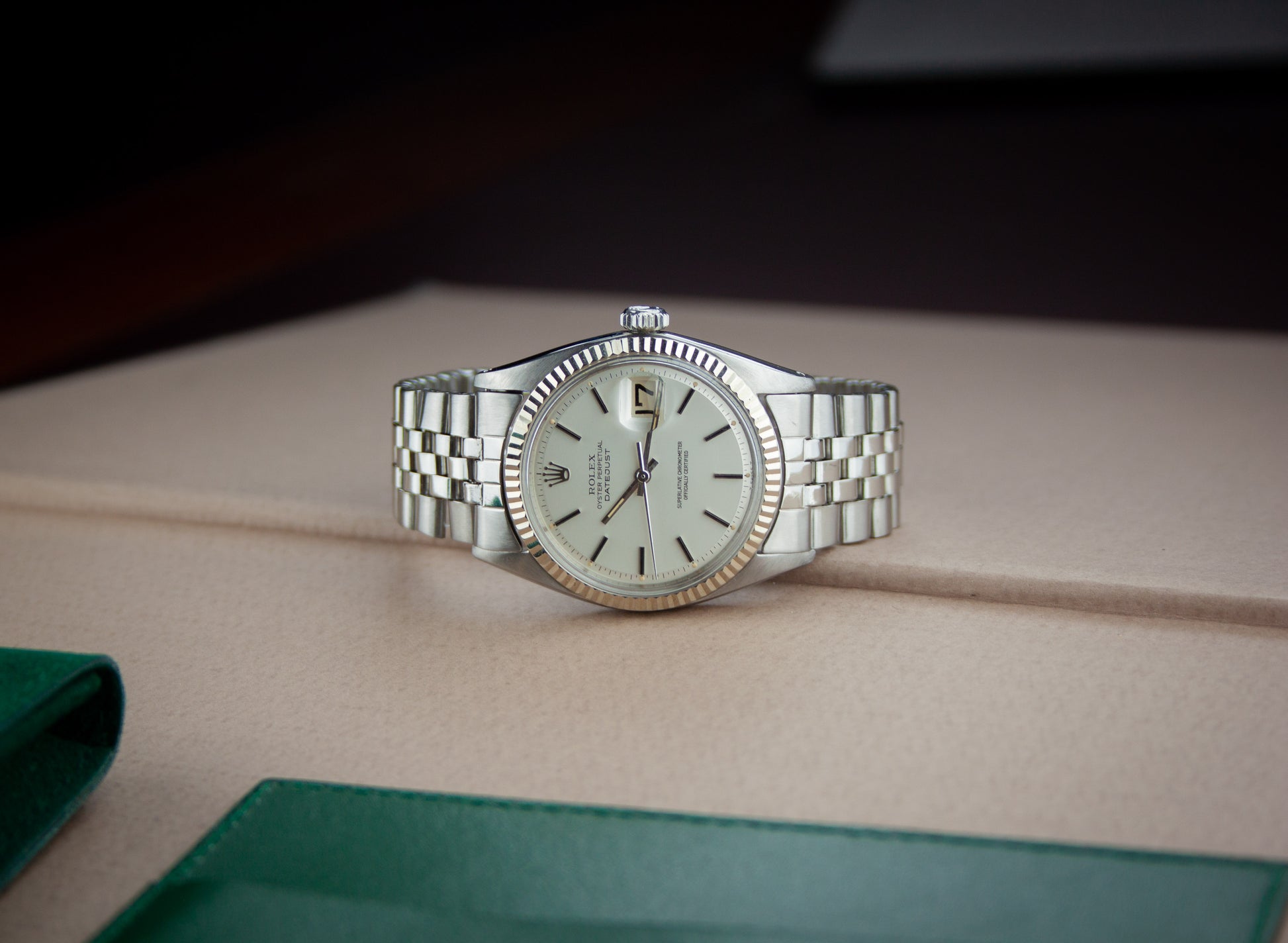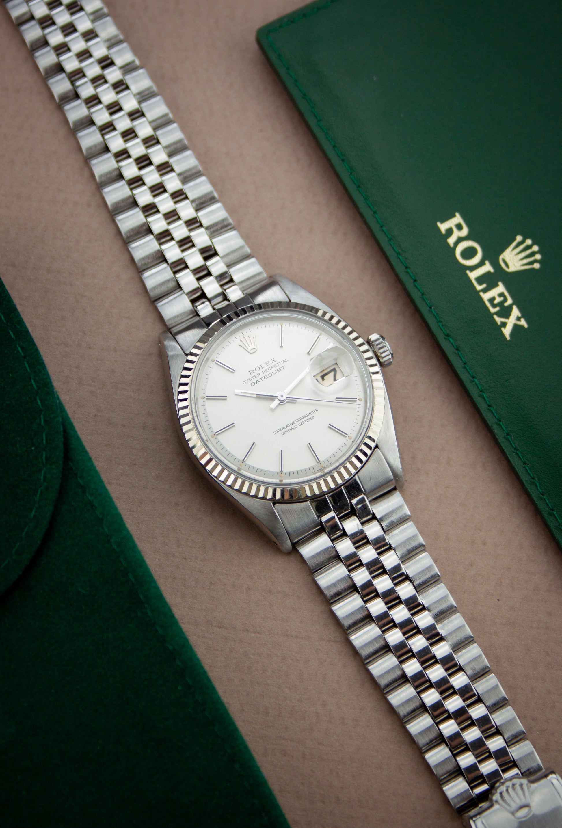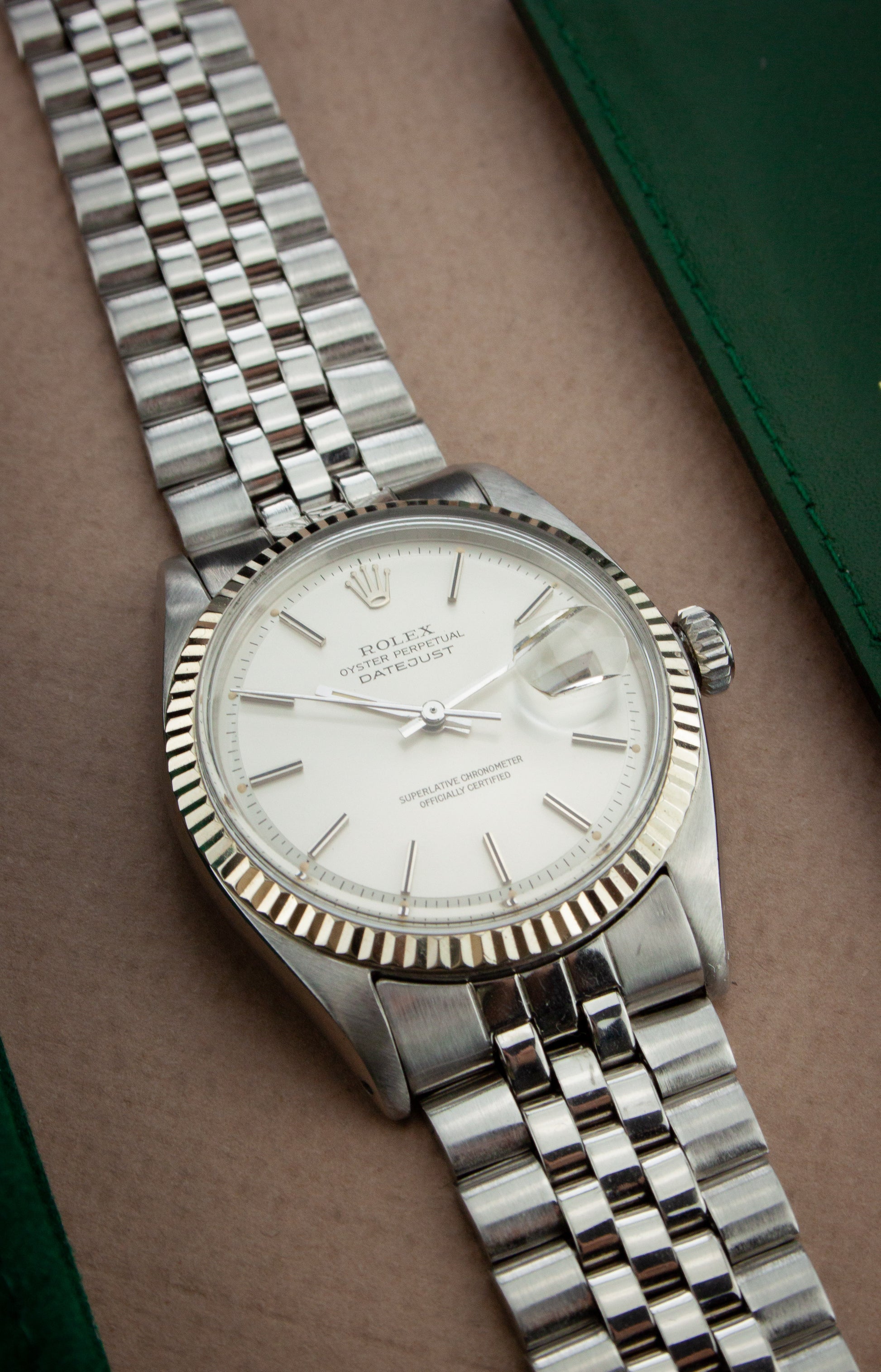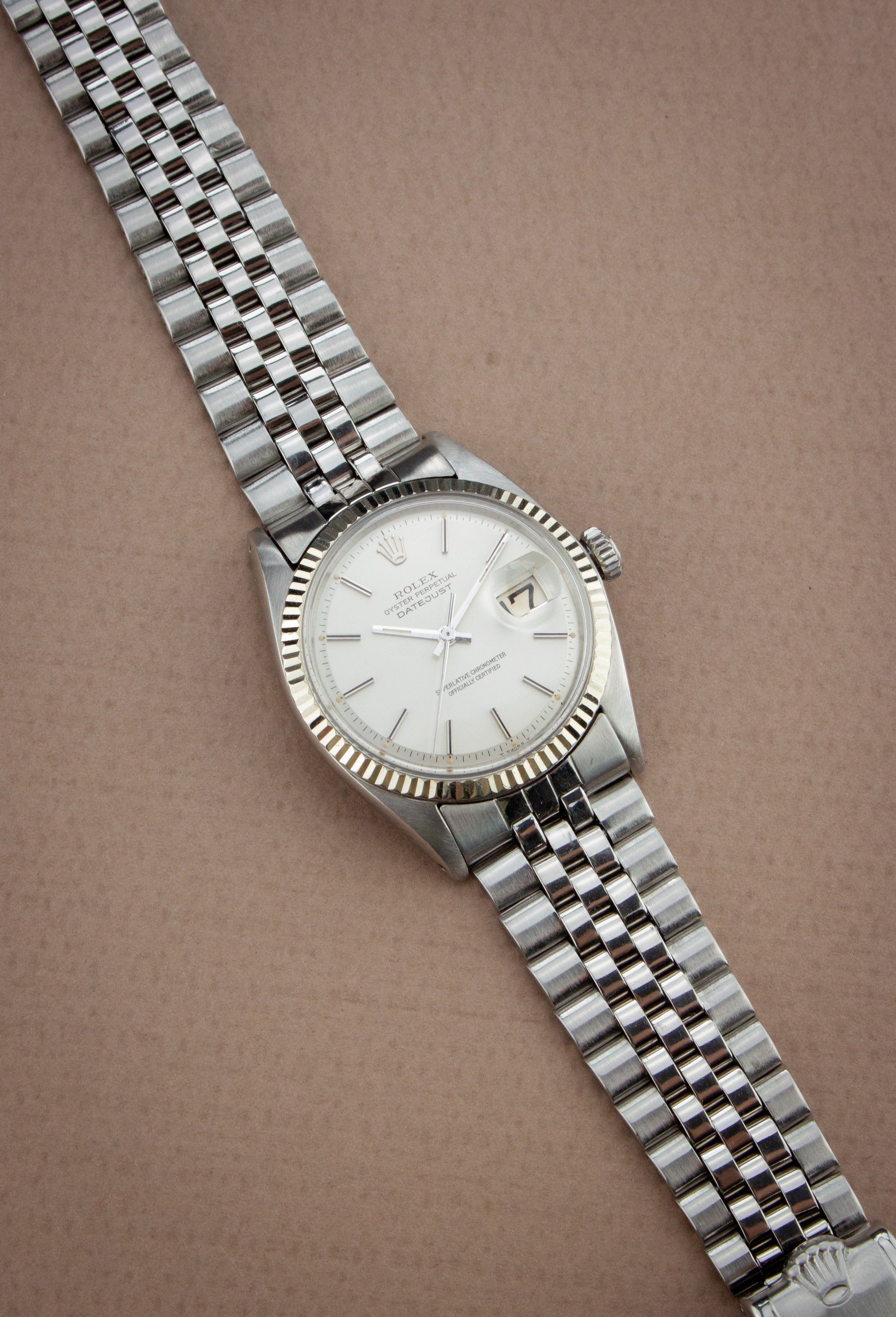 Deze ref. 1601 combineert de 36 mm Oyster stalen kast, witgouden fluted bezel, stalen jubilee band en zilver kleurige wijzerplaat. We zien de wijzerplaat met stalen uurmarkeringen en stalen tritium wijzers, wat het nog meer uitgesproken maakt.
