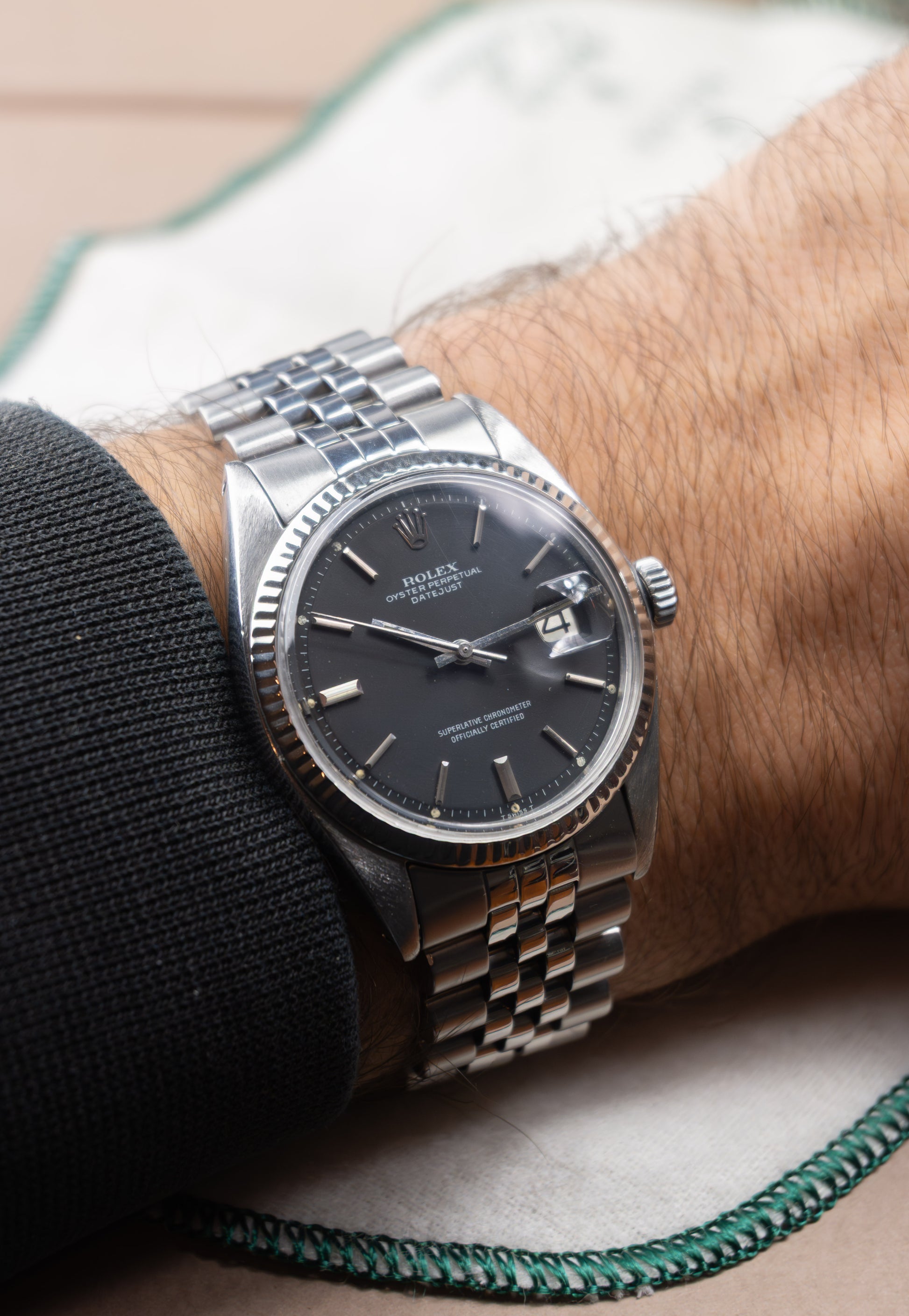 Deze ref. 1601 combineert de 36 mm Oyster stalen kast, witgouden fluted bezel, stalen jubilee band en matte zwart kleurige wijzerplaat. We zien de wijzerplaat met stalen uurmarkeringen en stalen wijzers, wat het nog meer uitgesproken maakt.