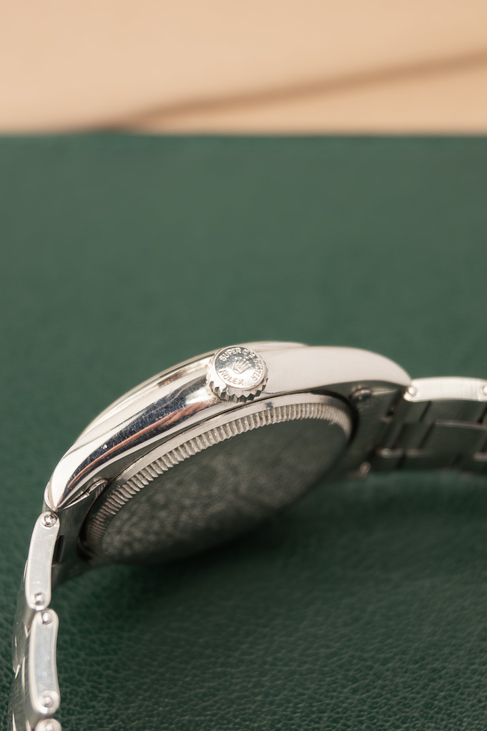 Deze ref. 6094 combineert de 34 mm stalen Oyster kast, stalen Rivet suspensie band en creme wijzerplaat. We zien de wijzerplaat met goudkleurige sunken claw uurmarkeringen en goudkleurige sword stijl wijzers wat het nog meer uitgesproken maakt.
