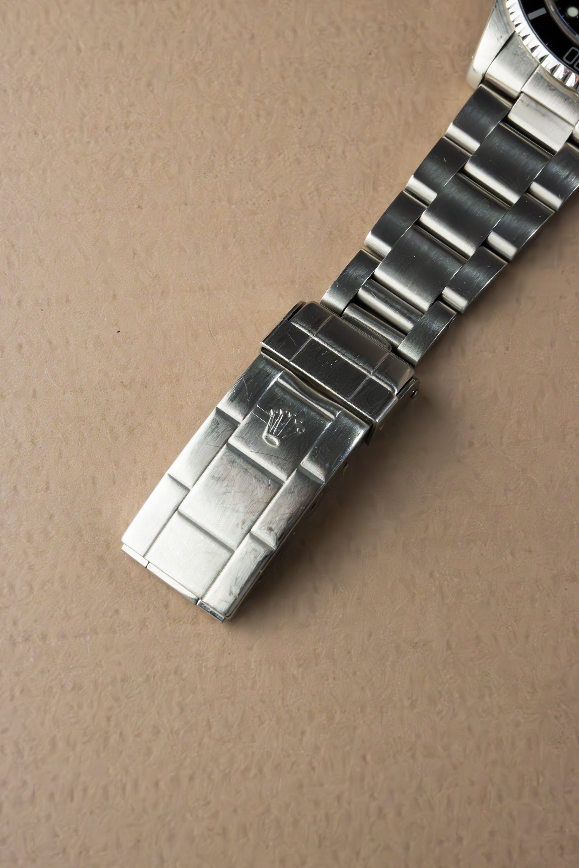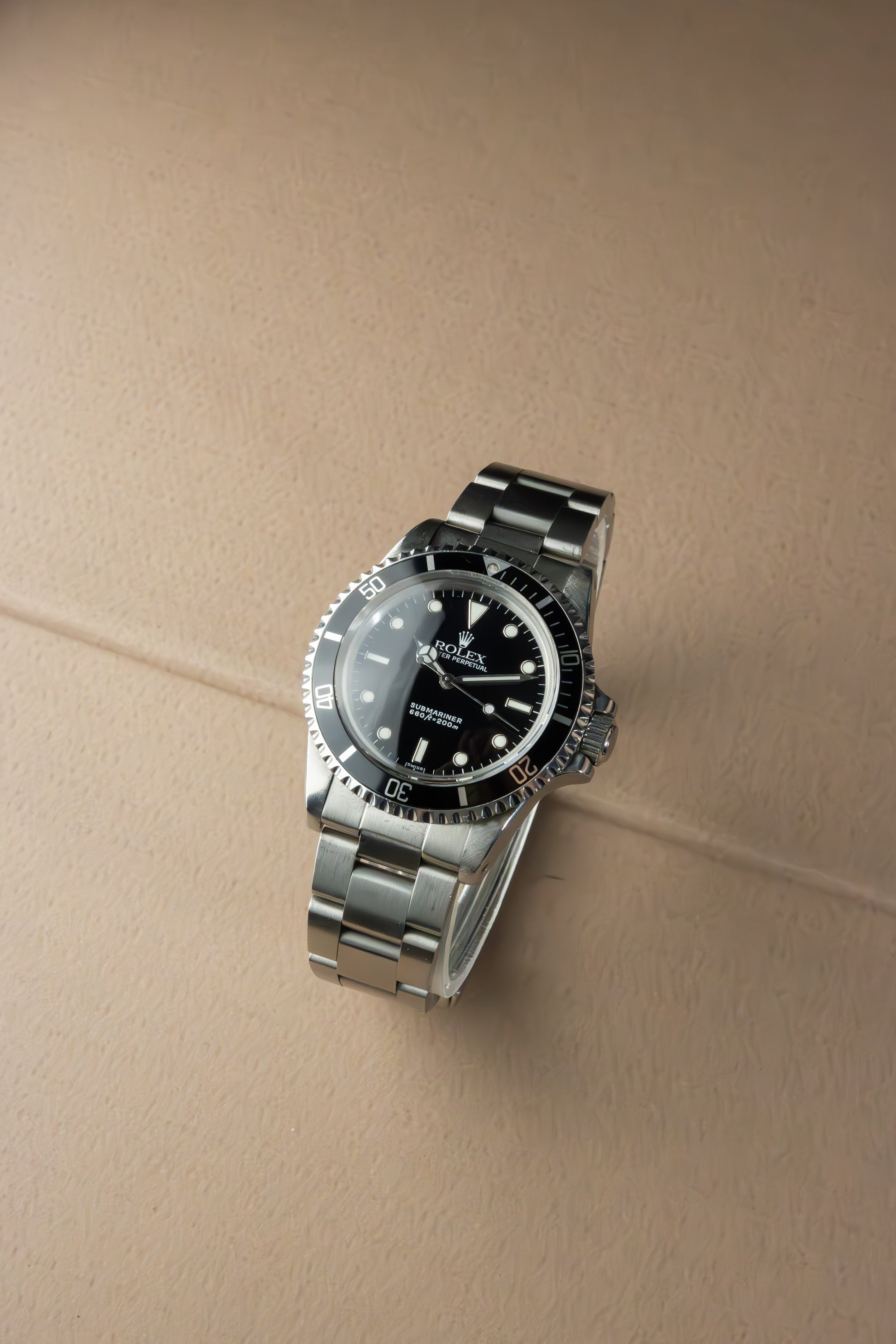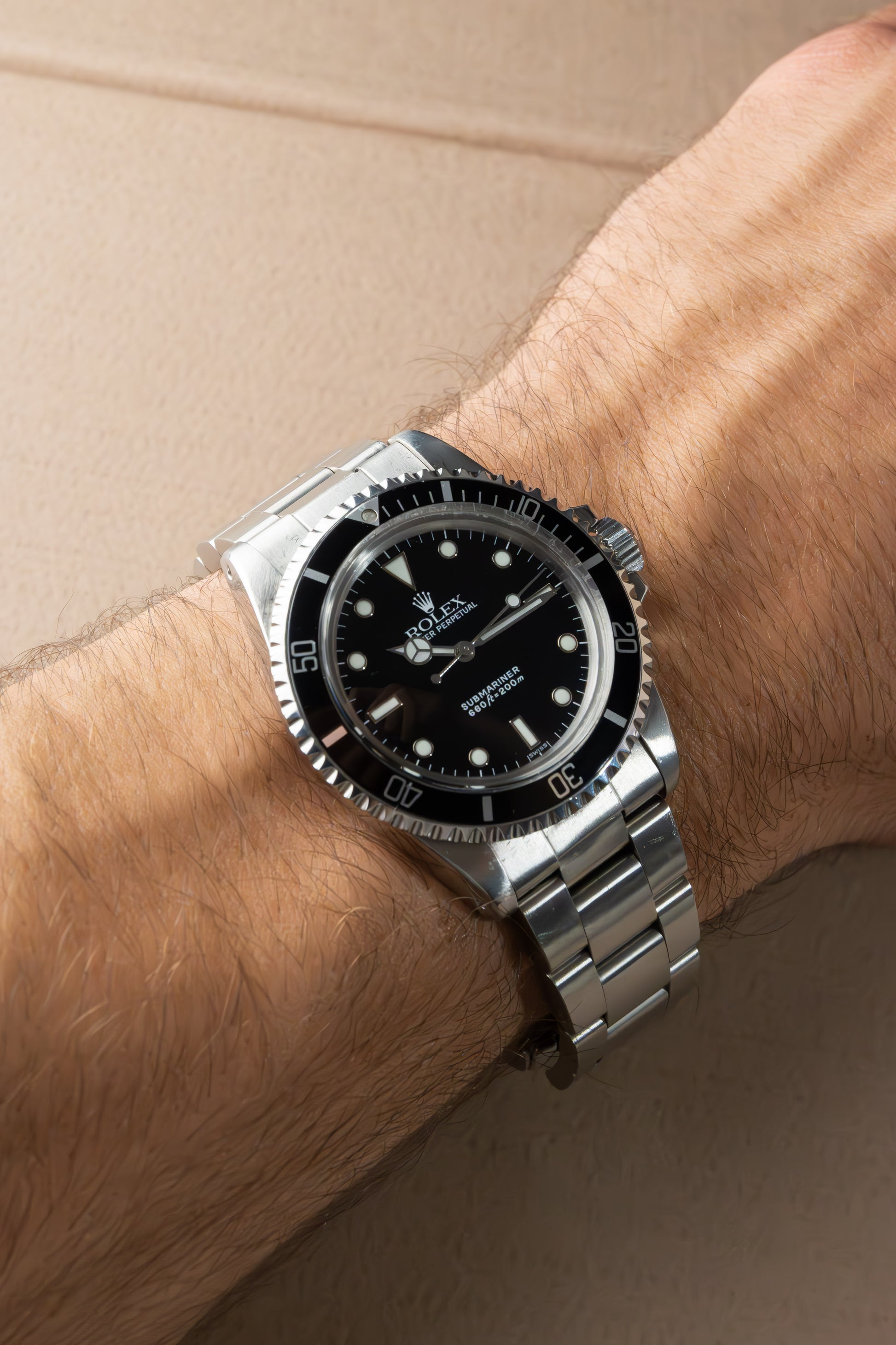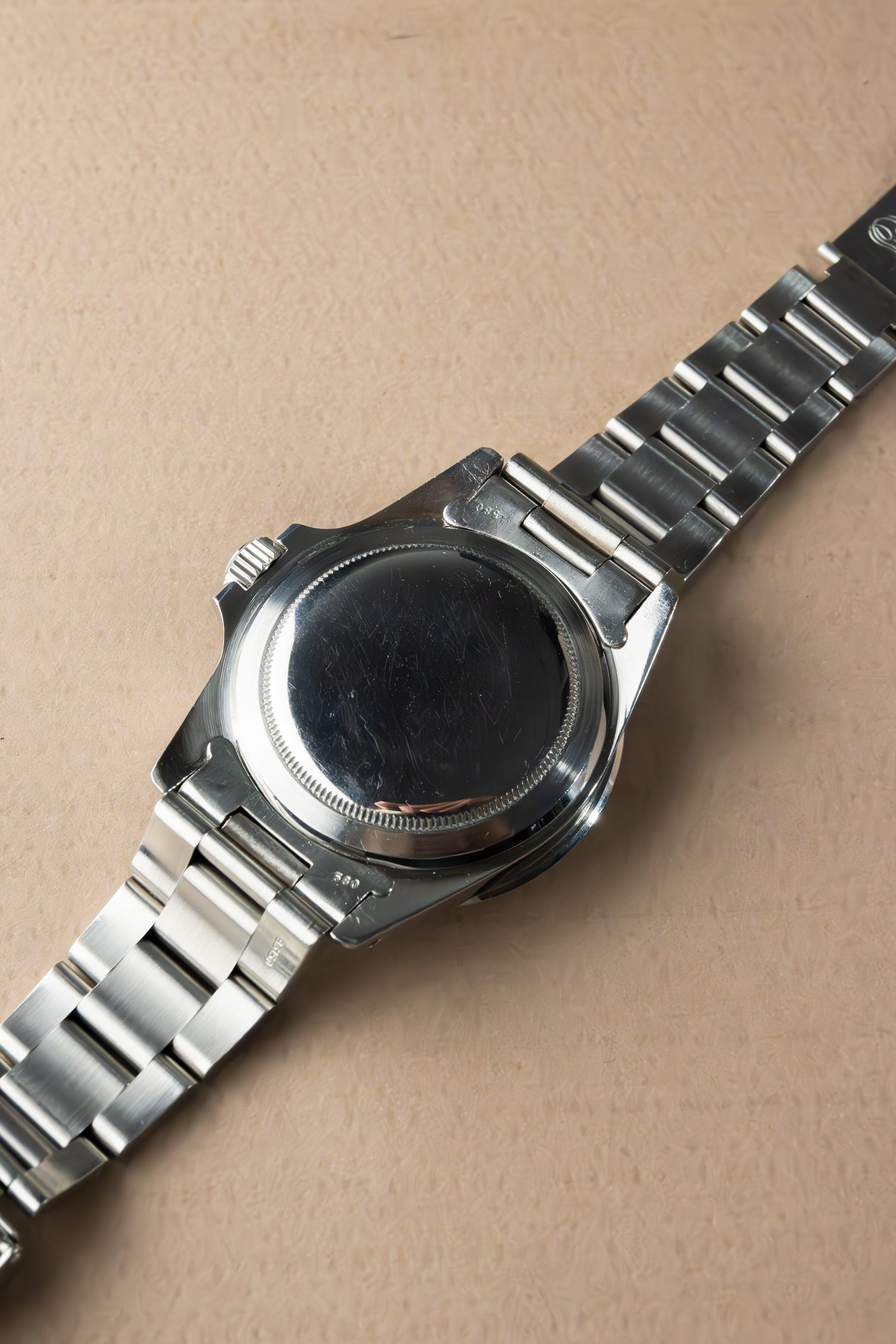 Deze ref. 5513 combineert de 40 mm Oyster stalen kast, rotating bezel, stalen Oyster band en zwart kleurige wijzerplaat. We zien de wijzerplaat met stalen uurmarkeringen en stalen wijzers, wat het nog meer uitgesproken maakt.