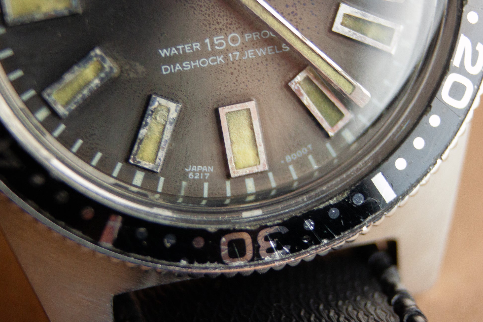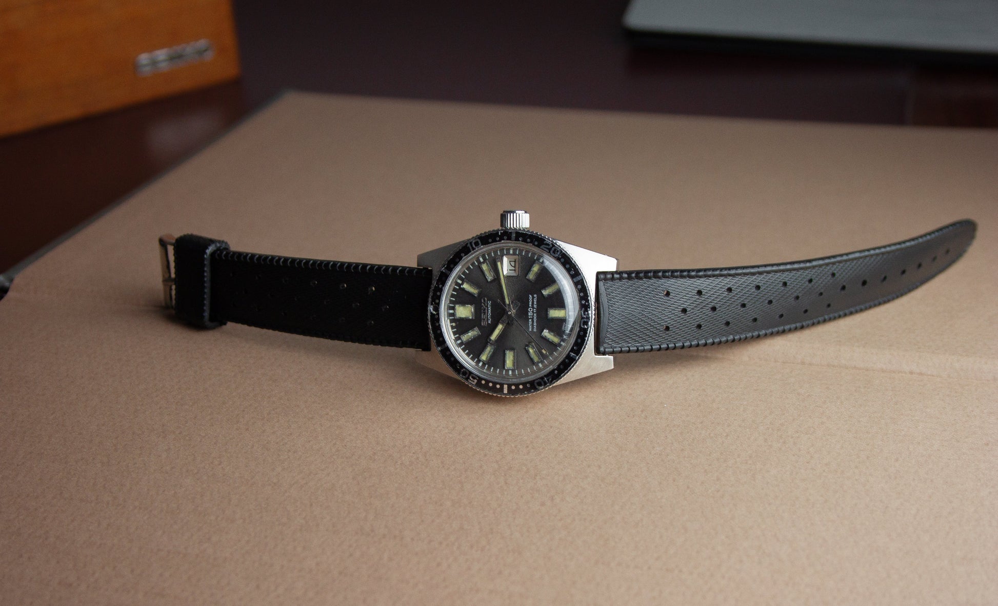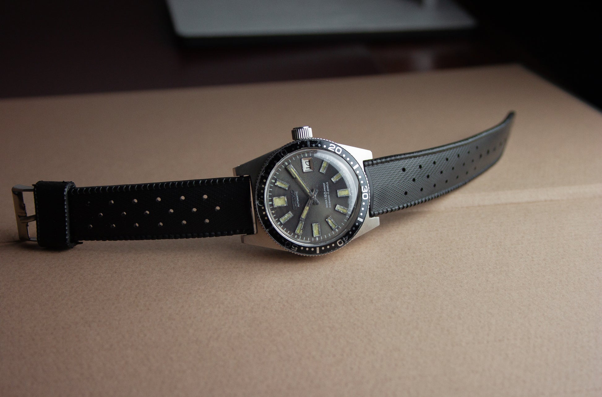 Deze ref. 6216 combineert de 37 mm stalen kast, zwarte rotating bezel, rubberen band en grijs kleurige wijzerplaat. We zien de wijzerplaat met stalen tritium uurmarkeringen en stalen tritium wijzers, wat het nog meer uitgesproken maakt.